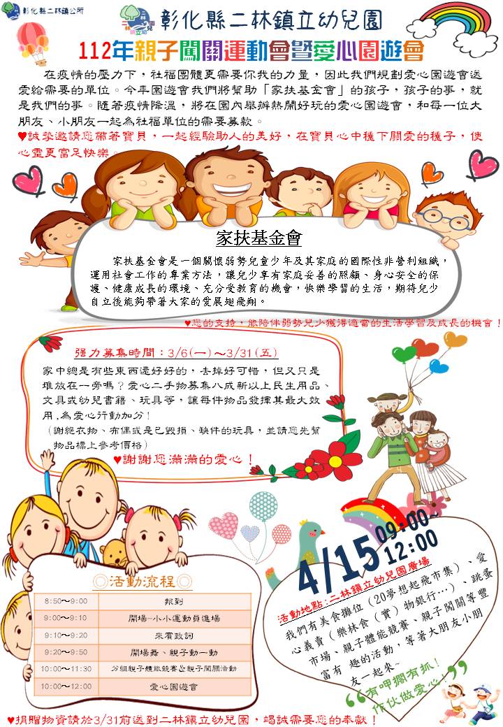 最新公告 彰化縣二林鎮立幼兒園112年親子闖關運動會暨愛心園遊會公告,活動當天有美食攤位(20夢想起飛市集)、愛心義賣(樂林食(實)物銀行…)、跳蚤市場、親子體能競賽、親子闖關等豐富有趣的活動,等著大朋友小朋友一起來~ 歷史訊息 | 發布日期: 2023/03/27~2023/04/15 | 瀏覽人數: 48人 | 聯絡資訊: 行政室粘芷林 8969906分機115 活動日期:112年4月15日[星期六]活動時間:上午9時~12時活動地點:二林鎮立幼兒園廣場※活動當天有美食攤位(20夢想起飛市集)、愛心義賣(樂林食(實)物銀行…)、跳蚤市場、親子體能競賽、親子闖關等豐富有趣的活動,等著大朋友小朋友一起來~