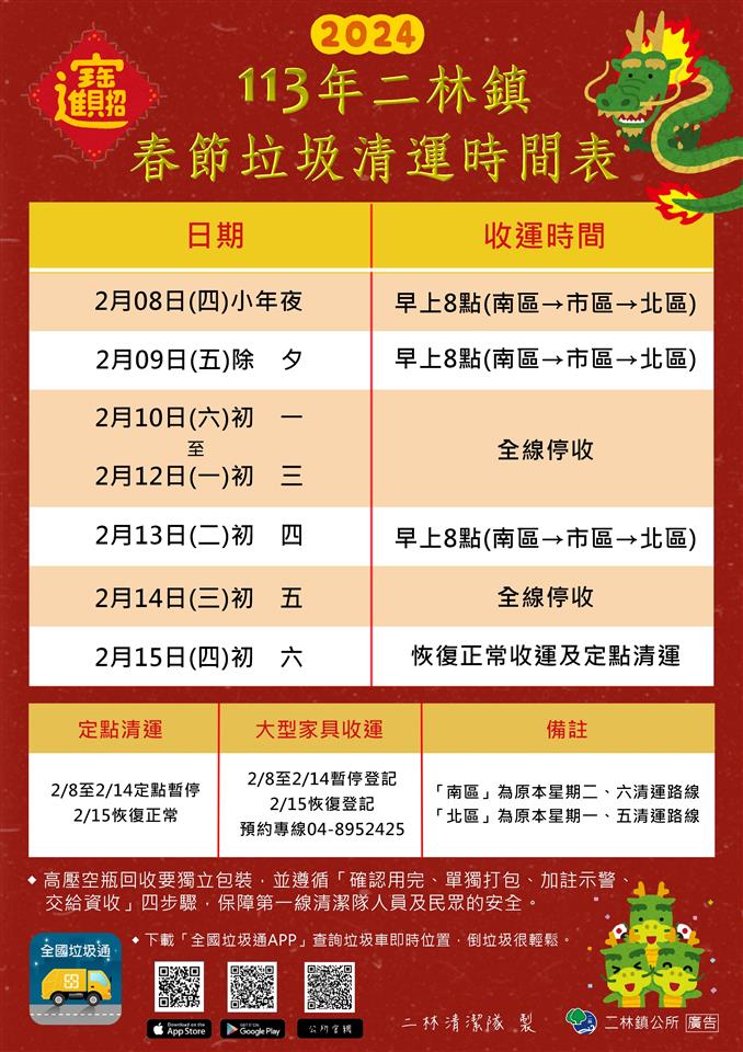 最新公告 113年二林鎮春節期間垃圾清運公告 歷史訊息 | 發布日期: 2024/01/11~2024/02/11 | 瀏覽人數: 82人 | 聯絡資訊: 洪小姐 8969906分機203 春節連假將至,為加強服務鄉親,本所大型家具及垃圾清運時間如下: 一、2/8(小年夜)、2/9(除夕)、2/13(初四)全鎮上午8點起開始由南區→市區→北區沿線清運。 二、初一、初二、初三及初五全線垃圾停收,2/8至2/14暫停定點清運服務,2/15(星期四)恢復正常清運及定點服務。 三、大型家具清運電話受理至1/31(星期三)下午五點止,可撥打清潔隊專線04-8952425預約登記。 四、高壓空瓶回收要獨立包裝,並遵循「確認用完、單獨打包、加註示警、交給資收」四步驟,保障第一線清潔隊人員及民眾的安全。 五、歡迎下載『全國垃圾通』APP,隨時追蹤垃圾車即時位置,倒垃圾很輕鬆。