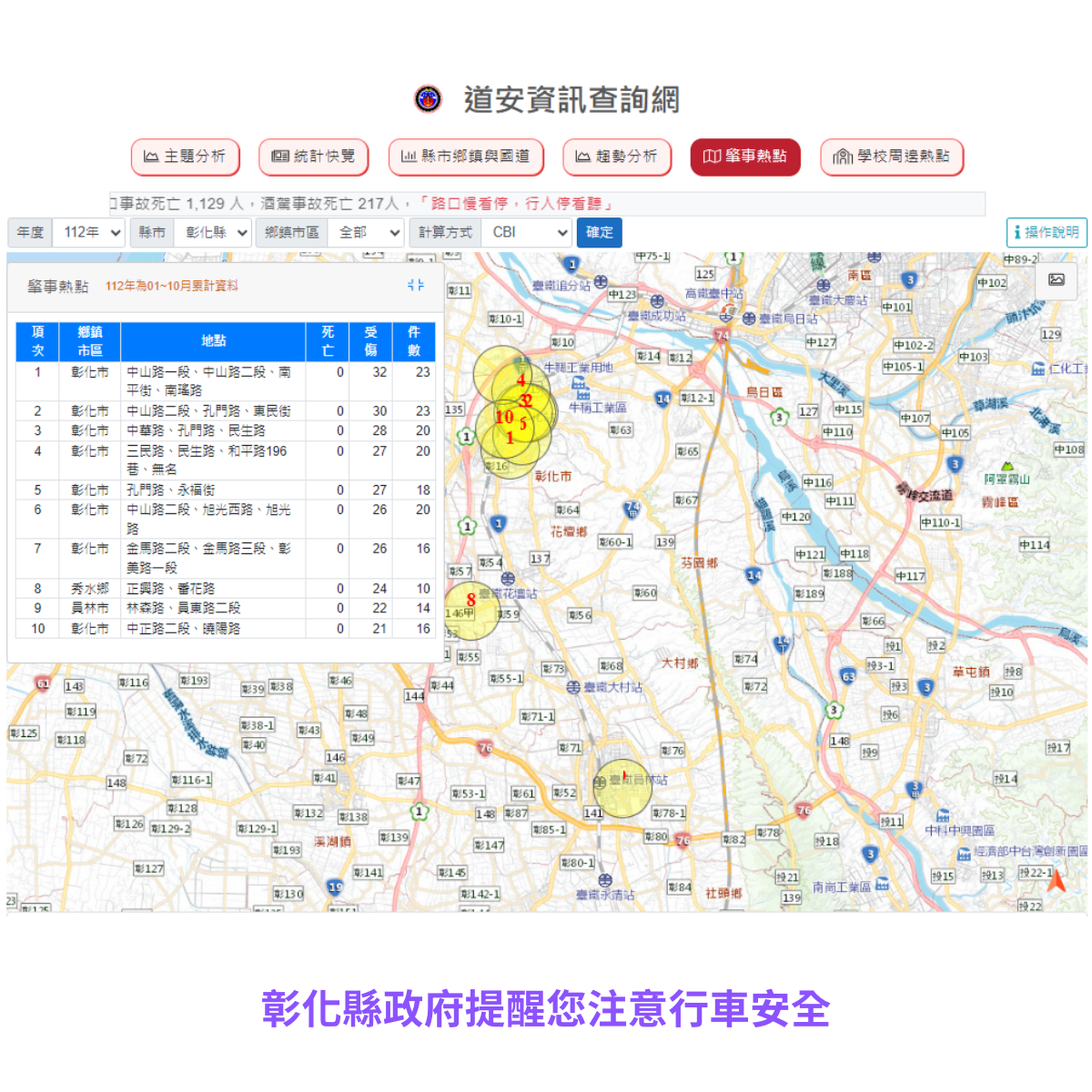 其他資訊 本縣112年1-10月道路交通事故死傷累計26,081人 歷史訊息 | 發布日期: 2024/01/11~2024/02/11 | 瀏覽人數: 26人 | 聯絡資訊: 洪雪娥 8969906分機115