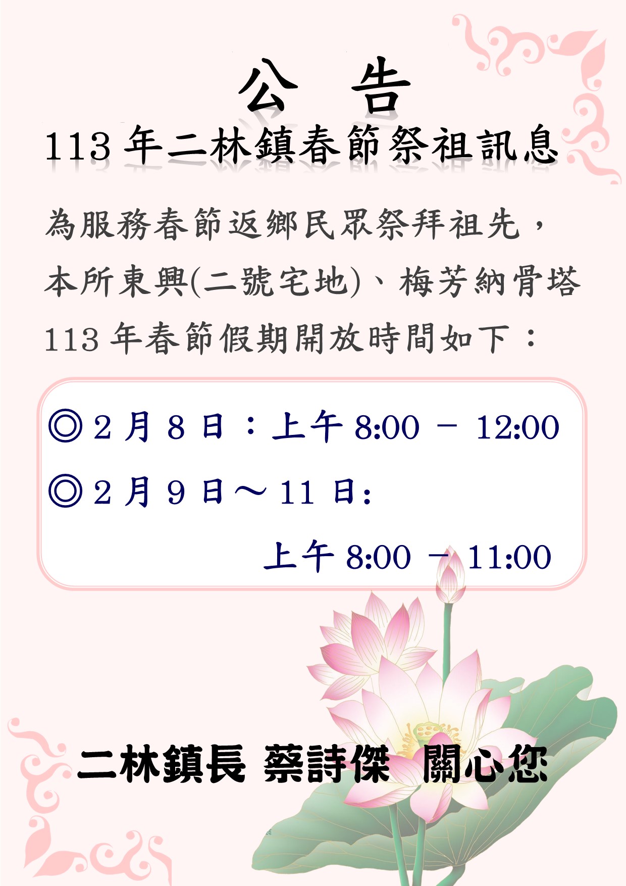 最新公告 113年東興及梅芳納骨塔春節期間祭祀開放時間 歷史訊息 | 發布日期: 2024/01/29~2024/02/11 | 瀏覽人數: 37人 | 聯絡資訊: 張仁聰 8969906分機152 春節期間持續服務大家,113年東興及梅芳納骨塔春節期間祭祀,開放時間如下:2/8(四)8:00-12:002/9-11(除夕-初二)8:00-11:00二林鎮長 蔡詩傑 祝您新年快樂~
