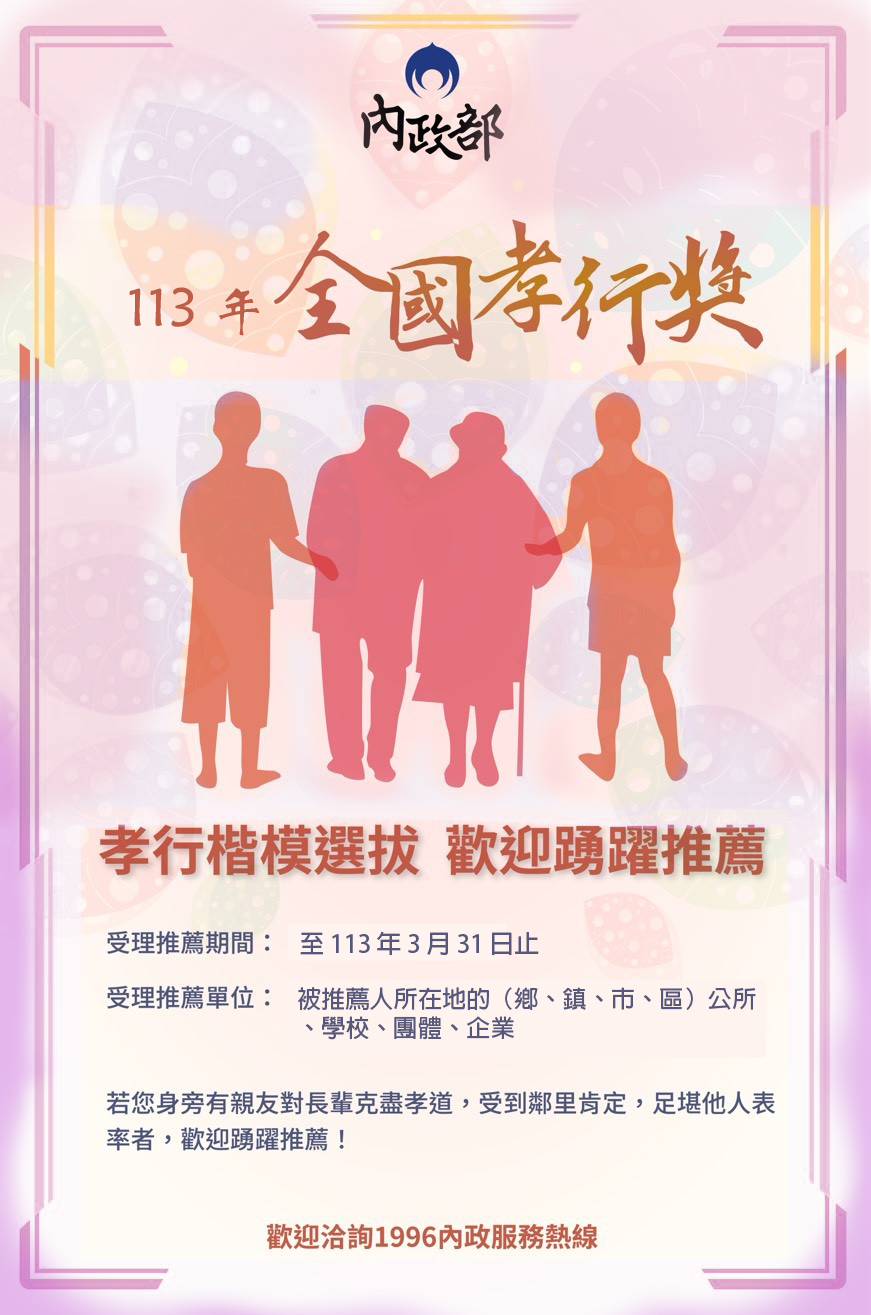 最新公告 內政部「113年全國孝行獎 孝行楷模選拔 歡迎踴躍推薦」 歷史訊息 | 發布日期: 2024/02/06~2024/03/31 | 瀏覽人數: 48人 | 聯絡資訊: 洪瑩珊 8969906分機154
