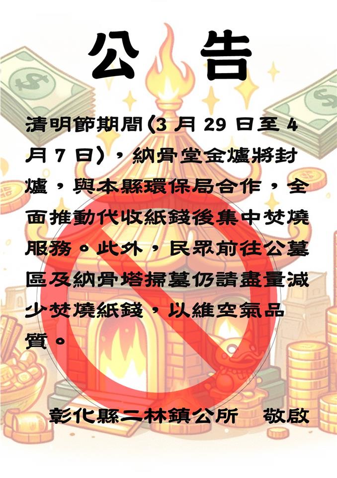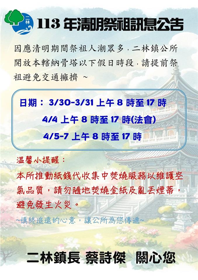 最新公告 公所開放本鎮納骨塔以下假日時段開放 歷史訊息 | 發布日期: 2024/03/08~2024/04/07 | 瀏覽人數: 90人 | 聯絡資訊: 郭玟均 8969906分機152 清明期間祭祖人潮眾多,公所開放本鎮納骨塔以下假日時段開放請提前祭祖避免交通擁擠 ~★日期:3/30-3/31上午8時至17時 4/4上午8時至17時(法會)4/5-7上午8時至17時☉溫馨小提醒:公所推動紙錢代收集中焚燒服務以維護空氣品質,請勿隨地焚燒金紙及亂丟煙蒂,避免發生火災。二林鎮長 蔡詩傑 關心您~