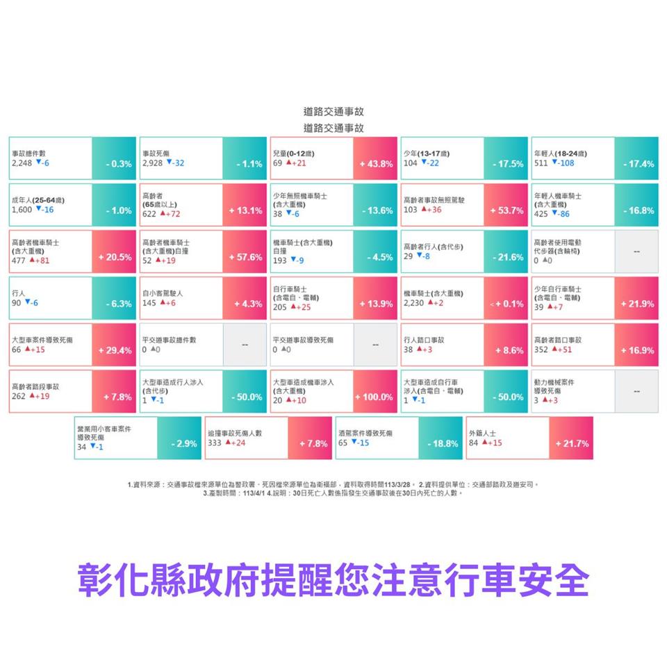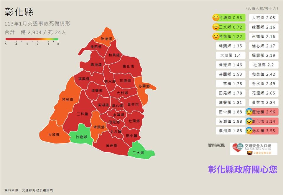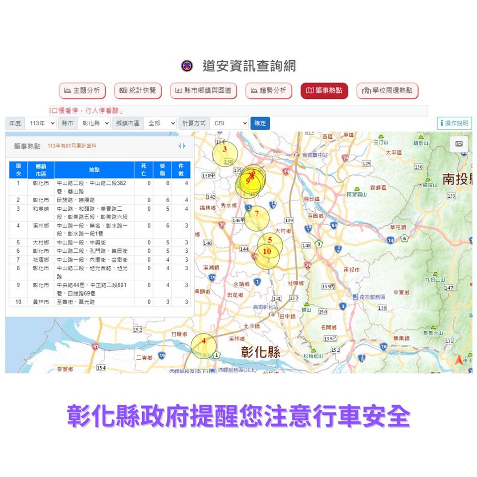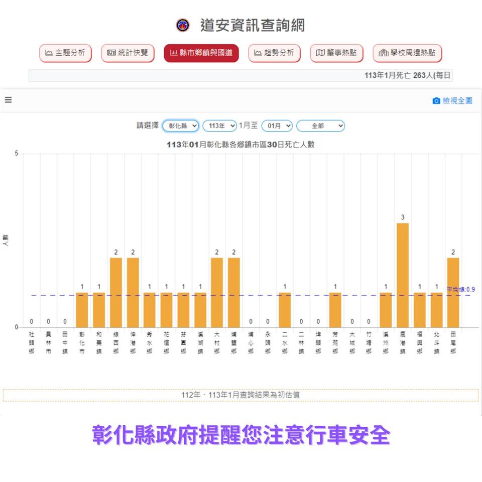 其他資訊 本縣113年1月道路交通事故死傷累計2,928人,請運用既有宣傳通路及網站或臉書頁面協助加強宣導,共同降低死傷人數 歷史訊息 | 發布日期: 2024/04/09~2024/05/30 | 瀏覽人數: 18人 | 聯絡資訊: 林炎調 8969906分機115