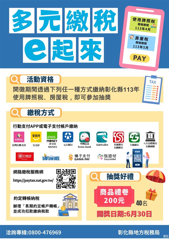 其他資訊 113年度「多元繳稅e起來」廣宣活動 歷史訊息 | 發布日期: 2024/04/22~2024/05/31 | 瀏覽人數: 41人 | 聯絡資訊: 張延年 8969906分機162 一、 旨揭活動期間為113年4月及5月,只要於開徵期間用約定轉帳繳納或採e化繳稅管道(行動支付、電子支付工具及繳稅服務網站)繳納彰化縣113年使用牌照稅、房屋稅即可參加抽獎。 二、 相關活動詳情可參閱本局官網或粉絲團查詢,或撥本局免費服務電話0800-476969洽詢。