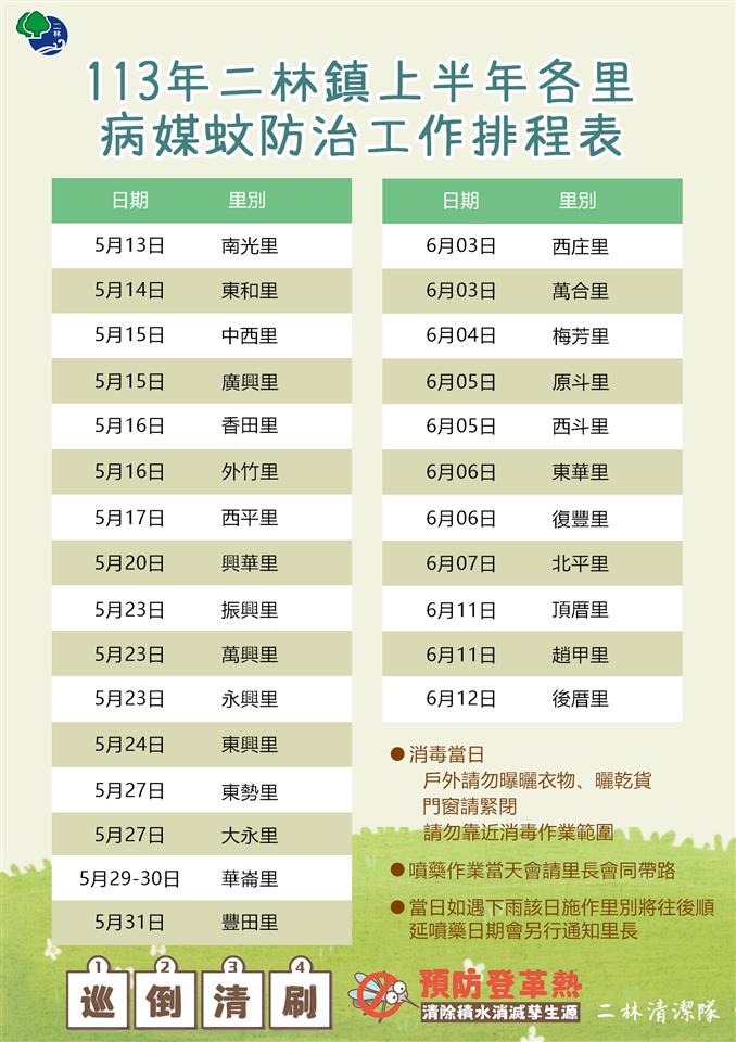 最新公告 113年二林鎮上半年各里病媒蚊防治工作 歷史訊息 | 發布日期: 2024/05/06~2024/06/06 | 瀏覽人數: 48人 | 聯絡資訊: 洪小姐 8969906分機204 登革熱防治工作開跑本鎮從5月份開始,針對各里巷道、溝渠、景點展開環境衛生噴藥消毒,於消毒當日請提早收妥曬衣物、曬乾貨,勿靠近消毒作業範圍,敬請鄉親們配合。若因氣候或其他因素導致無法依表定日期噴藥,清潔隊將與里長另排定時間實施。防止病媒蚊孳生不能單靠清潔隊噴藥消毒,噴藥只能殺死成蚊,且密集噴藥也會使病媒蚊產生抗藥性,最有效、最重要的方法為保持良好的環境衛生環境,並依「巡、倒、清、刷」方式清除積水容器,使病媒蚊無法產卵繁殖。