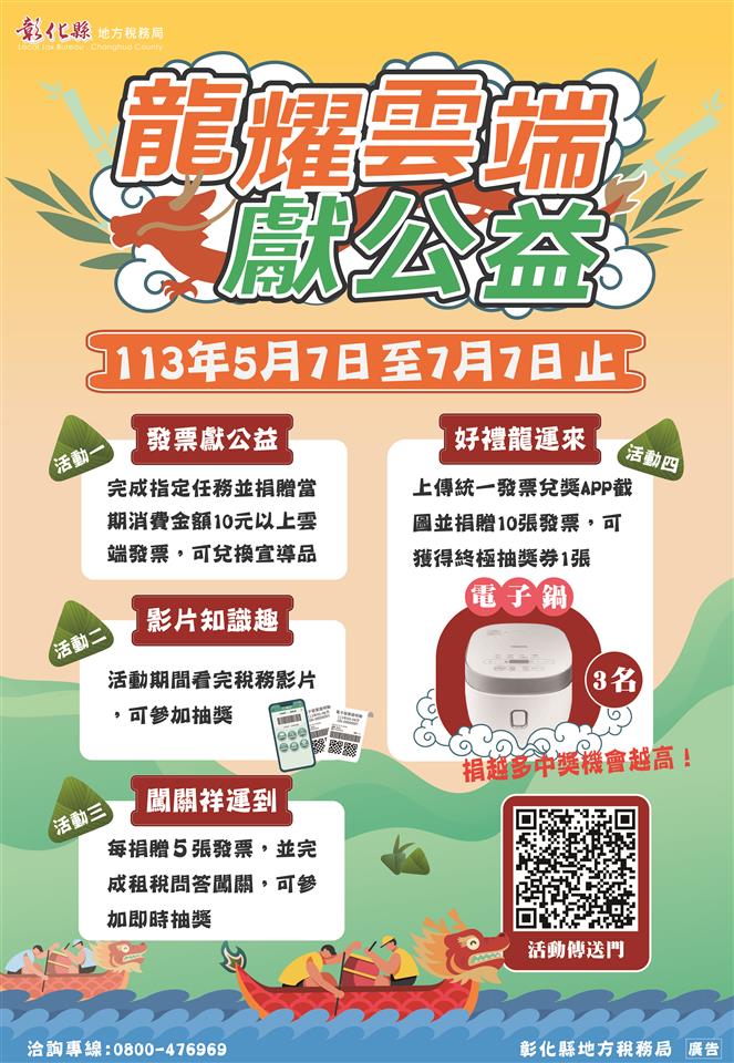 其他資訊 為推廣各項稅務新知及雲端發票政策,稅務局舉辦「龍耀雲端獻公益」租稅宣導活動 歷史訊息 | 發布日期: 2024/05/07~2024/06/07 | 瀏覽人數: 35人 | 聯絡資訊: 廖念馨 8969906分機164 一、 旨揭活動自113年5月7日起至113年7月7日止,說明如下:(一) 發票獻公益:完成指定任務並按累積捐贈雲端發票張數可兌換對應張數之宣導品。(二) 影片知識趣:活動期間看完稅務影片,可參加抽獎。(三) 闖關祥運到:每捐贈5張發票並完成租稅問答關卡,可參加即時抽獎。(四) 好禮龍運來:上傳統一發票兌獎APP截圖並捐贈10張發票,可獲得終極抽獎券1張,捐愈多中獎機會越高。二、 檢附宣導活動電子檔1份,相關活動詳情可參閱本局官網活動訊息或粉絲團查詢,或活動網站(https://changtax.toyou.tw)查詢。