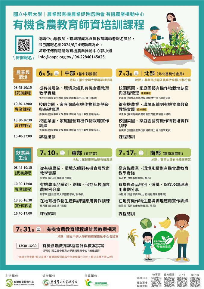 其他資訊 國立中興大學113年6月5日至7月31日辦理「有機食農教育師資培訓課程」 歷史訊息 | 發布日期: 2024/05/08~2024/06/08 | 瀏覽人數: 57人 | 聯絡資訊: 陳冠穎 8969906分機189 一、 為提升食農教育師資之有機農業相關認知與實作教學,及強化有機食農教育師資之專業性,國立中興大學有機農業推動中心辦理「有機食農教育師資培訓課程」,敬邀中小學教師、有興趣成為有機食農教育師資者報名。二、 旨揭辦理資訊說明如下:(一) 開課時間、課程名稱及課程地點1、 113年6月5日(星期三)08:45-17:00,「從有機農業、環境永續到有機食農教育教學實踐」、「校園菜圃、家庭園藝有機作物栽培訣竅與基礎管理」、「校園菜圃、家庭園藝有機作物栽培實作訓練」,課程地點:國立中興大學農業試驗場。2、 113年7月3日(星期三)08:45-17:00,「校園菜圃、家庭園藝有機作物栽培訣竅與基礎管理」、「從有機農業、環境永續到有機食農教育教學實踐」、「校園菜圃、家庭園藝有機作物栽培實作訓練」,課程地點:桃園區農業改良場樹林分場。3、 113年7月10日(星期三)08:45-17:00,「從有機農業、環境永續到有機食農教育教學實踐」、「有機農產品辨別、選購、保存及校園食農案例分享」、「在地有機作物生產與調理應用實作訓練」,課程地點:花蓮東豐拾穗農場。4、 113年7月17日(星期三)08:45-17:00,「從有機農業、環境永續到有機食農教育教學實踐」、「有機農產品辨別、選購、保存及調理應用案例分享」、「在地有機作物生產與調理應用實作訓練」,課程地點:臺南太康有機農業專區。5、 113年7月31日(星期三)13:30-16:30,「有機食農教育課程設計與教案撰寫」(實體暨線上直播),課程地點:國立中興大學有機農業推動中心會議室。(二) 課程對象:中小學教師、有興趣成為有機食農教育師資者。(三) 報名方式及截止日期:採網路報名,相關辦法請詳見有機農業推動中心網站「服務項目 最新活動 中心有機活動」專區填寫報名表(https://www.oapc.org.tw/2024-0412-organic-agrifood-education/),報名截止日期為113年6月14日或額滿截止。(四) 課程費用:免費,實體課程報名成功後需繳納保證金500元,全程參與課程者將全額退費。