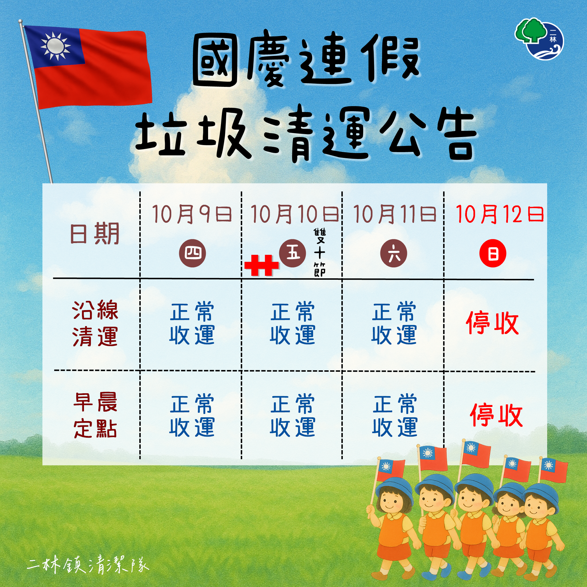 最新公告 國慶連假正常清運公告 歷史訊息 | 發布日期: 2025/10/07~2025/10/11 | 瀏覽人數: 120人 | 聯絡資訊: 洪小姐 8969906分機205 10/9(四)、10/10(五)、10/11(六)沿線清運及早晨定點皆維持正常服務喔!10/12(日) 為例假日停收。