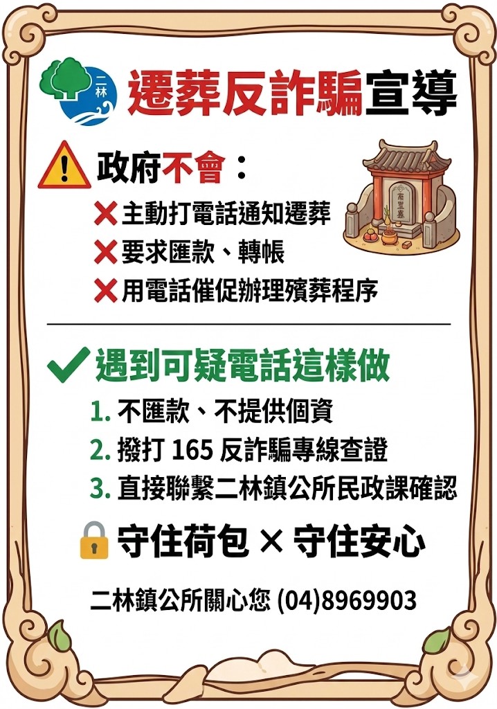 最新公告 反詐騙「公墓起掘」 發布日期: 2025/12/01~2026/01/01 | 瀏覽人數: 21人 | 聯絡資訊: 林炎調 8969906分機115 ⚠️近日有不肖人士假借「公墓起掘」致電行詐,提醒鄉親提高警覺小心詐騙,接獲可疑電話切記三步驟:1. 🚫不匯款、不提供個資2. 撥打1️⃣6️⃣5️⃣反詐騙專線查證3. 聯繫二林鎮公所民政課確認(04)8969903🔒 守住荷包 × 守住安心二林鎮公所 關心您