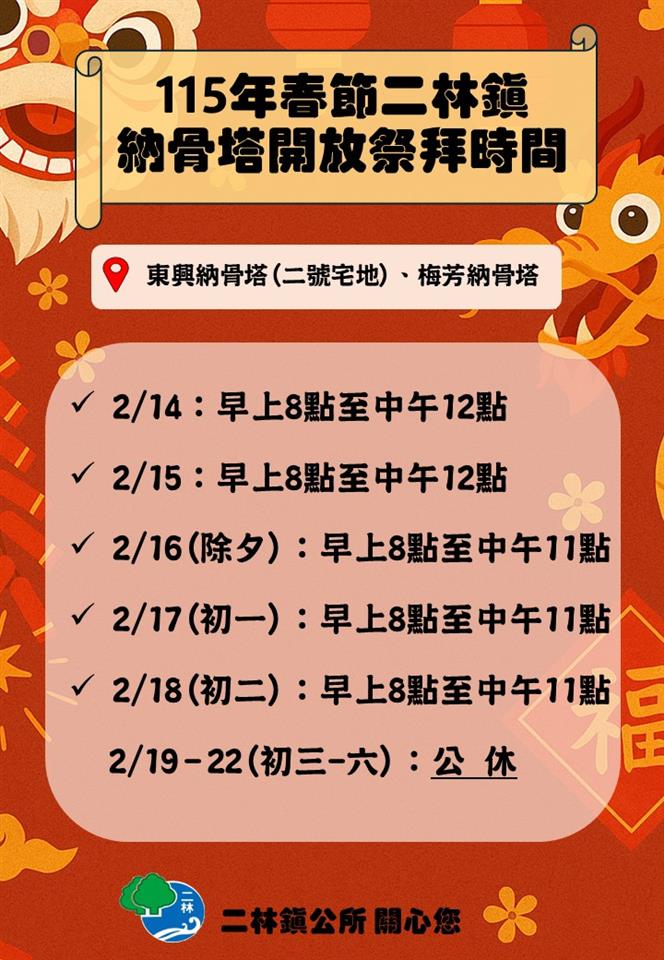 最新公告 二林鎮公所春節期間持續提供服務 發布日期: 2026/01/06~2026/02/18 | 瀏覽人數: 21人 | 聯絡資訊: 郭紋均 8969906分機152 二林鎮公所春節期間持續提供服務,115年春節連假期間本鎮東興及梅芳納骨塔之祭祀開放時間如下:2/14-2/15上午8:00-12:002/16-2/18(小年夜~初二)上午8:00-11:00二林鎮長 蔡詩傑 祝您新年快樂~慎終追遠的心意,讓公所為您傳遞~