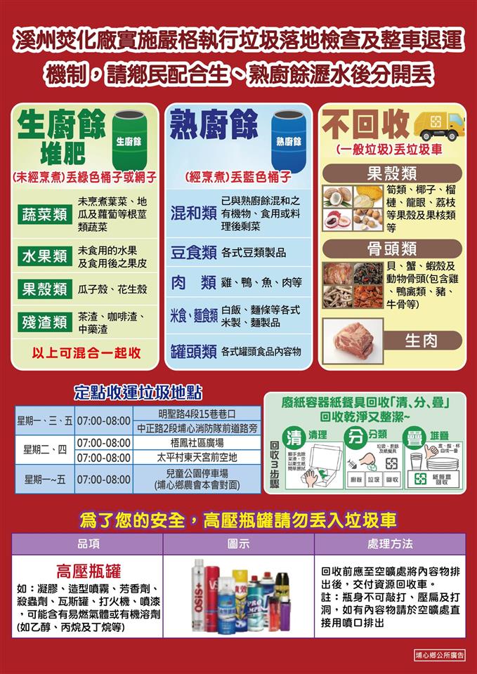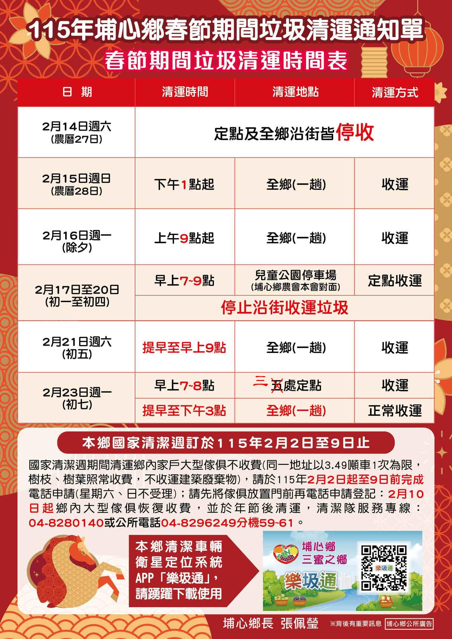 最新公告 115年埔心鄉春節期間垃圾清運通知單 發布日期: 2026/02/13~2026/03/13 | 瀏覽人數: 160人 | 聯絡資訊: 清潔隊 8296249分機60 更正通知2月23日週一(初七)清運地點五處為誤植,正確應為"三處"定點(圖片已更正),位置分別為明聖路四段15巷巷口兒童運動公園中正路二段埔心消防隊旁