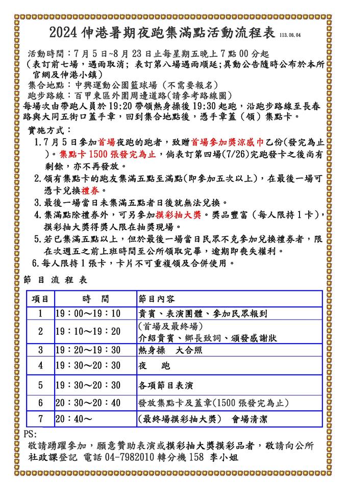 其他資訊 2024伸港暑期夜跑集滿點活動開跑了! 歷史訊息 | 發布日期: 2024/06/11~2024/09/06 | 瀏覽人數: 70人 | 聯絡資訊: 李小姐 7982010分機158 好消息!2024伸港暑期夜跑集滿點活動開跑了!獎品豐富,歡迎鄉民踴躍參加。