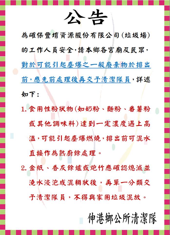 其他資訊 為確保豐堉資源股份有限公司(垃圾場)的工作人員安全。 歷史訊息 | 發布日期: 2024/11/07~2024/12/31 | 瀏覽人數: 116人 | 聯絡資訊: 黃小姐 7980027分機11 為確保豐堉資源股份有限公司(垃圾場)的工作人員安全,請本鄉各宮廟及民眾,對於可能引起塵爆之一般廢棄物於排出前,應先前處理後再交予清潔隊員,詳述如下: 1.食用性粉狀物(如奶粉、麵粉、番薯粉或其他調味料)達到一定濃度遇上高溫,可能引起塵爆燃燒,排出前可混水直接作為熟廚餘處理。 2.金紙、香灰餘爐或炮竹應確認熄滅並澆水浸泡成混稠狀後,再單一分類交予清潔隊員,不得與家用垃圾混放。