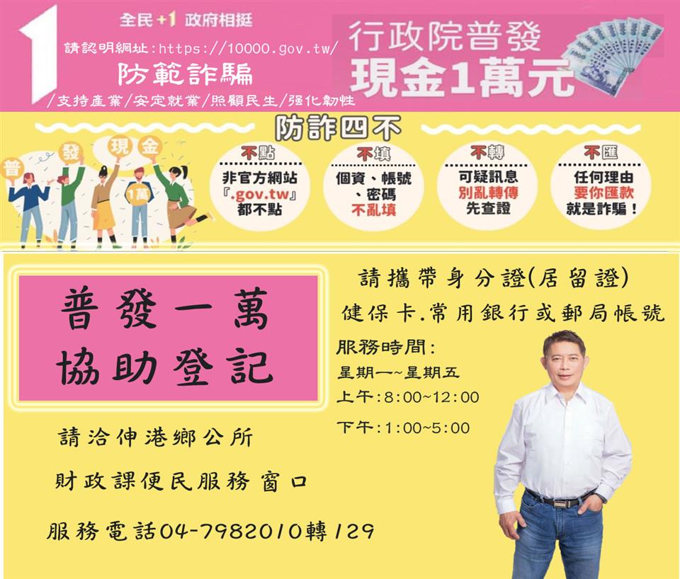 其他資訊 普發一萬 協助登記窗口 發布日期: 2025/11/06~2026/05/22 | 瀏覽人數: 284人 | 聯絡資訊: 王小姐 04-7982010分機129 🌟【普發現金1萬元💰伸港鄉公所陪您安心領】🌟 全民+1 政府相挺💰 行政院普發現金1萬元開放入帳! 為防範詐騙,也讓長者或不熟網路操作的鄉親更安心。 📍伸港鄉公所特別設立【普發一萬 協助登記窗口】 由財政課專責人員一對一協助線上登記! 🙍♂️🙍♀️ 歡迎有需要協助的鄉親於上班時間前來公所 請務必攜帶【三寶】: ✅ 本人/代理人/監護人身分證(居留證) ✅登記對象健保卡 ✅登記對象常用銀行/郵局存摺 📞 若有普發現金相關疑問,可撥打【1988】專線洽詢 或上網查詢 👉 https://10000.gov.tw/ 📅 依中央規定採身份證尾數分流登記 登記時程如下👇 🔹 11/6(週四):尾數 2、3 🔹 11/7(週五):尾數 4、5 🔹 11/10 (週一):不限尾數皆可登記 🕗 伸港公所財政課服務時間: 星期一~星期五 上午 8:00~12:00 下午 1:00~5:00 ☎️7982010轉129 ✨ #伸港鄉長黄永欽貼心提醒✨ 近期詐騙手法層出不窮,請勿點擊陌生簡訊或連結! 有疑問請直接洽公所或撥打 1988 專線, 讓我們一起守護您的荷包與安心 ❤️ #伸港鄉公所協助登記窗口 #普發一萬 #政府相挺 #防詐騙