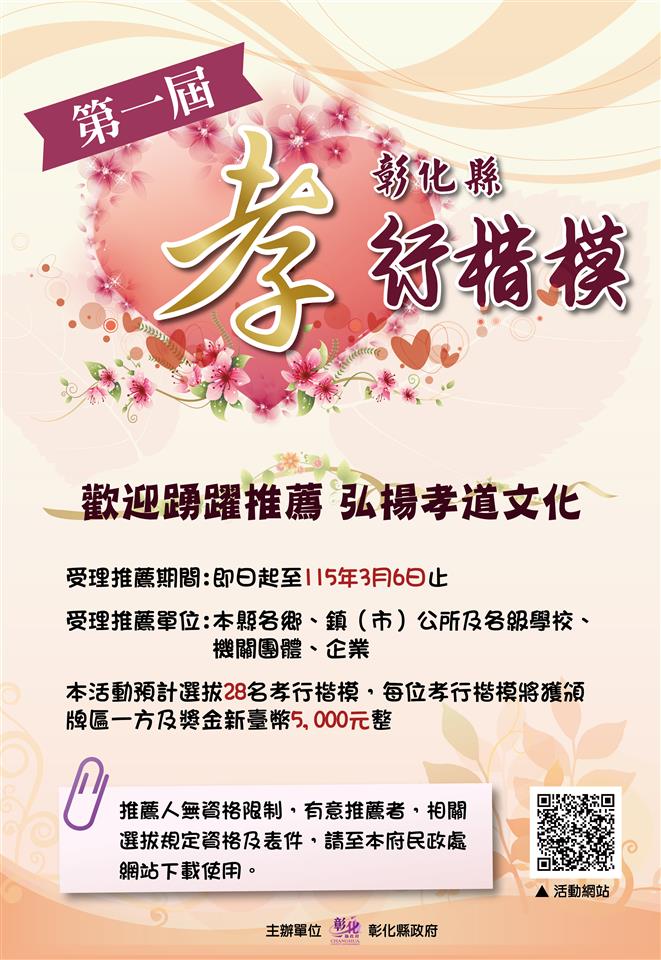 其他資訊 115年本縣孝行楷模選拔及遴薦參加全國孝行獎 發布日期: 2026/01/23~2026/12/31 | 瀏覽人數: 9人 | 聯絡資訊: 黃小姐 04-7982010分機111 115年本縣孝行楷模選拔及遴薦參加全國孝行獎,檢送孝行楷模選拔活動宣傳。