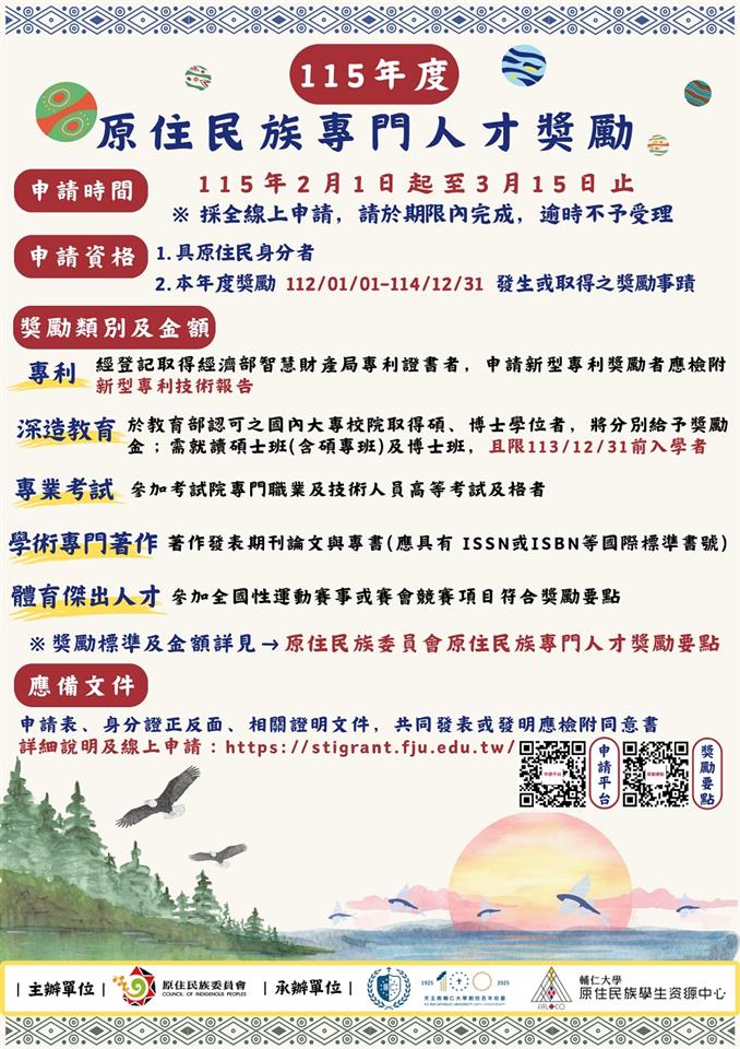 其他資訊 115年度原住民族專門人才頒獎典禮暨獎勵金核發工作計畫。 發布日期: 2026/01/26~2026/03/15 | 瀏覽人數: 13人 | 聯絡資訊: 黃小姐 04-7982010分機115 轉知輔仁大學學校財團法人輔仁大學辦理原住民族委員會「115年度原住民族專門人才頒獎典禮暨獎勵金核發工作計畫」,相關資訊詳說明。 說明: 一、申請日期: 115年2月1日起至115年3月15日止受理線上申請。 二、申請對象:凡具原住民身分,並符合獎勵要點規定者,可至「原住民族專門人才獎勵金申請平臺」(https://stigrant.fju.edu.tw/)辦理線上申報。 三、採線上申請制,請申請人務必於期限內完成資料上傳;相關獎勵標準依據「原住民族專門人才獎勵要點」辦理,可至該會主管法規系統(https://law.cip.gov.tw/)查詢。 四、聯絡資訊:02-2905-6473日小姐、02-2905-6201郭先生、02-2905-6373田小姐。
