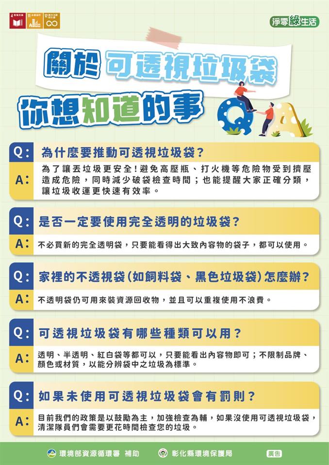 其他資訊 使用可透視垃圾袋, 垃圾分類看得清。 發布日期: 2026/04/09~2026/05/30 | 瀏覽人數: 6人 | 聯絡資訊: 林小姐 04-7980027分機113 使用可透視垃圾袋好處有哪些呢 ※可以目視檢查 是否分類正確,減少退運 ※避免 危險物品 混入垃圾裡,保障安全 ※提高垃圾車準時收運率, 減少等候的時間