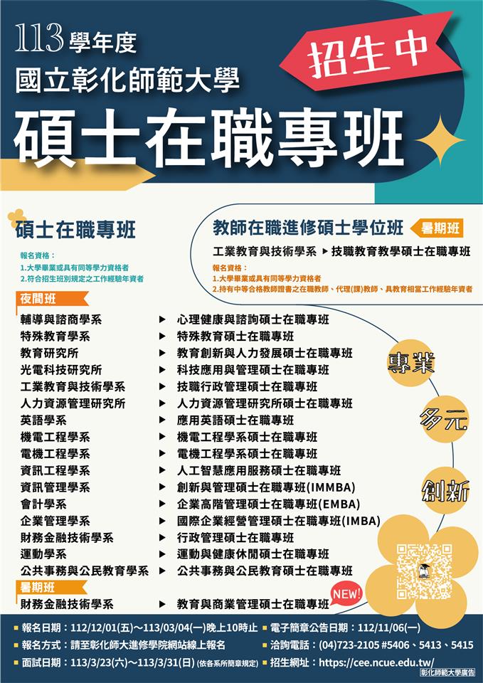 其他資訊 轉知彰師大「113學年度碩士在職專班」招生資訊及海報 歷史訊息 | 發布日期: 2023/12/07~2024/01/07 | 瀏覽人數: 38人 | 聯絡資訊: 劉智允 8972001分機104