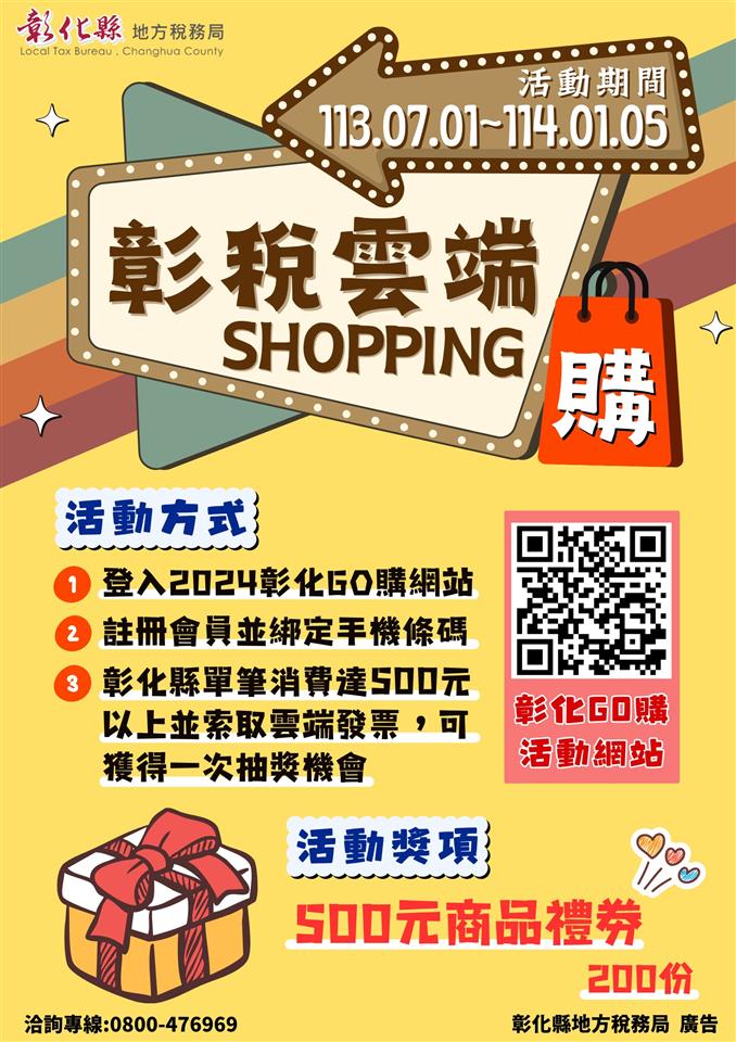 最新公告 【宣導】113年「彰稅雲端Shopping購」活動 歷史訊息 | 發布日期: 2024/07/30~2024/08/30 | 瀏覽人數: 49人 | 聯絡資訊: 洪美惠 8972001分機210 活動期間自即日起至114年1月5日止,期間內至2024彰化GO購活動網站(https://changhua-go.chcg.gov.tw/)註冊會員綁定手機條碼,並於本縣消費時使用「手機條碼」索取雲端發票,且單張消費金額達500元以上,即可獲抽獎序號,就有機會取得500元全聯禮券等好禮。