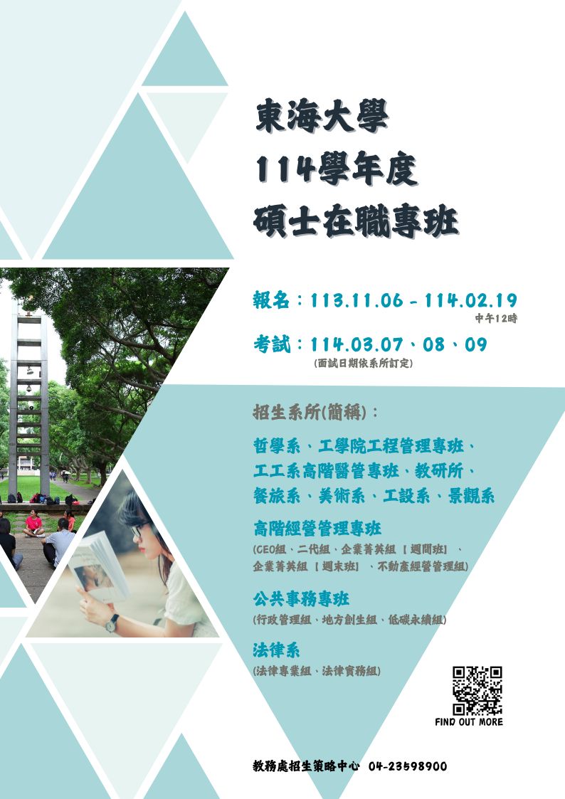 其他資訊 東海大學114學年度碩士在職專班招生 歷史訊息 | 發布日期: 2024/11/28~2024/12/28 | 瀏覽人數: 90人 | 聯絡資訊: 蕭于瑄 04-23590121#22602 一、旨揭招生係採網路報名,其相關期程及考試方式如下: (一) 報名日期:即日起至114年2月19日中午12時。 (二) 所有系所考試方式採「書面審查」及「面試」。 (三) 面試日期:114年3月7日至9日,各系所自訂,請詳閱招生簡章。 二、114學年度碩士在職專班招生系所(組)新增工學院工程管理專班及高階經營管理專班EMBA(不動產經營管理組)。 三、14學年度碩士在職專班招生系所:哲學系、資工系、工工系高階醫管專班、工學院工程管理專班、高階經營管理專班EMBA(CEO組、企業二代組、企業菁英組【週間班】、企業菁英組【週末班】、不動產經營管理組)、教育研究所、公共事務專班(行政管理組、地方創生組、低碳永續組)、餐旅系、美術系、工設系、景觀系、法律系(法律專業組、法律實務組)。 四、 檢附本校114學年度碩士在職專班招生簡章,報考資格、招生名額及相關報名事項請至本校招生資訊網站查詢(本校網址:http://recruit.thu.edu.tw)。