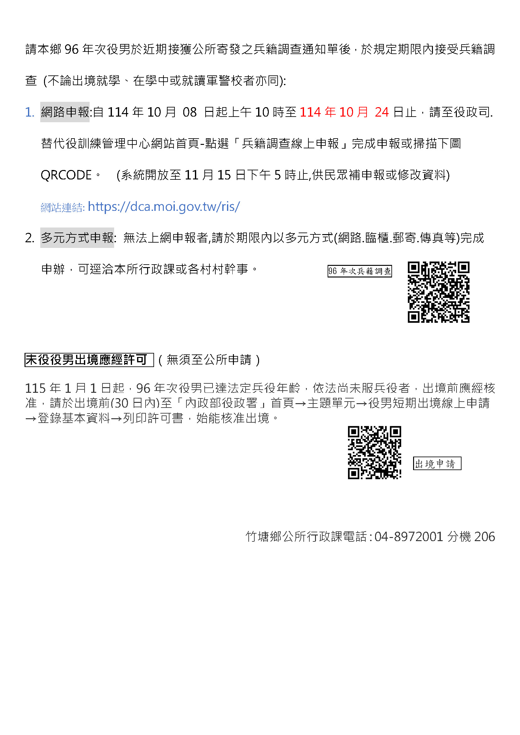 其他資訊 96年次役男兵籍調查 發布日期: 2025/10/08~2025/11/08 | 瀏覽人數: 10人 | 聯絡資訊: 呂小姐 04-8972001分機206 96年次役男於近期接獲公所寄發之兵籍調查通知單後,於規定期限內接受兵籍調查。
