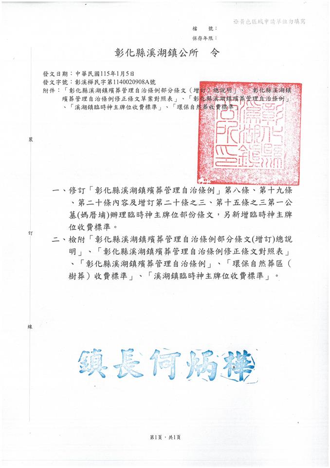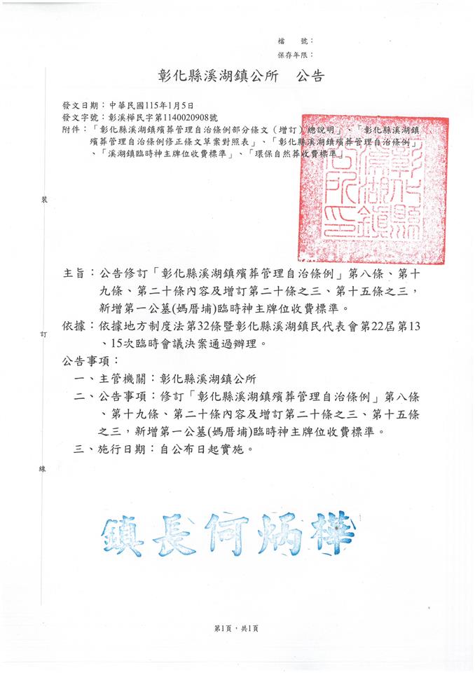其他資訊 【轉知】「彰化縣溪湖鎮殯葬管理自治條例」及修訂第八條、第十九條、第二十條及增訂本條例第二十條之三、第十五條之三條文內容、公告、令、條文全文、總說明、條文對照表及新增第一公增(媽厝埔)臨時神主牌位收費標準 發布日期: 2026/01/08~2026/02/08 | 瀏覽人數: 7人 | 聯絡資訊: 陳文心 04-8972001分機123