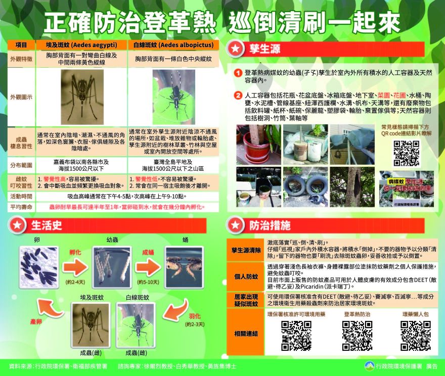 其他資訊 登革熱病媒蚊防治 發布日期: 2026/02/03~2026/03/03 | 瀏覽人數: 7人 | 聯絡資訊: 詹惠如 8972001分機175 登革熱防治核心為「巡、倒、清、刷」清除孳生源,無特效藥與疫苗。民眾應每週檢查並清理積水容器,著淺色長袖衣物並使用合格防蚊液。病媒蚊叮咬高峰為上午9-10時、下午4-5時,防範斑蚊需落實居家內外環境清潔,降低病媒蚊密度是預防根本。 一、 孳生源清除「巡、倒、清、刷」 「巡」:巡視室內外環境,檢查花瓶、水盤、輪胎、帆布等容器。 「倒」:倒掉積水,隨時保持容器乾燥。 「清」:清除不需要的廢棄物。 「刷」:刷洗容器內壁以去除蟲卵,避免蚊子再度產卵。 重點檢查區:盆栽底盤、屋頂陽台、空屋、空地、屋簷排水槽、水桶、瓶罐、廢輪胎等。 二、 個人防蚊與防護措施 防護衣物:戶外活動時穿著淺色長袖衣褲,並穿著淺色衣物(蚊子趨光性較不喜淺色)。 防蚊藥劑:在身體裸露部位適當使用衛福部核可的防蚊藥劑 (含DEET、Picaridin或IR3535成分)。 環境防蚊:家中裝設紗窗、紗門,並使用電蚊拍或捕蚊燈。病媒蚊叮咬高峰期(日出後1-2小時、日落前2-3小時)避免在陰暗處逗留。 三、 病患防疫與注意事項 發病後5日內:病患應在家休息,並避免被蚊子叮咬,以防病毒經蚊子散播。 居住環境:加裝紗窗、紗門、睡在蚊帳內。 就醫提示:若出現發燒、頭痛、後眼窩痛、肌肉關節痛、紅疹等症狀,應儘速就醫並告知旅遊活動史