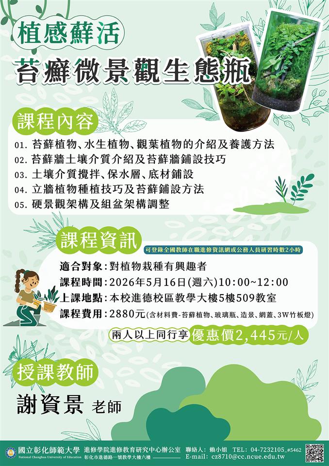 其他資訊 【轉知】國立彰化師範大學-進修學院推廣教育課程「【AI賦能.跨域應用】創意行銷與多媒體視覺創作」、「【植感蘚活】苔蘚微景觀生態瓶」課程簡章 發布日期: 2026/03/23~2026/04/23 | 瀏覽人數: 17人 | 聯絡資訊: 張姳薇 04-8972001分機119 一、 「【AI賦能.跨域應用】創意行銷與多媒體視覺創作」(一) 課程特色:本課程採實作導向,透過 AI 文案策劃、視覺生成、短影音腳本編排及自動化剪輯四階段,在 6 小時內強化學員的數位行銷實務能力,成為能即時產出社群內容的全能創作者。(二) 課程時間:115年5月2日 (週六)09:00-16:00,共計6小時。(三) 課程費用:3,000元,開課前1個月報名享早鳥價2,700元;兩人以上同行每人享2,700元優惠。以上優惠擇一使用,不可併用。二、 「【植感蘚活】苔蘚微景觀生態瓶」(一) 課程特色:本課程從土壤介質與植藝基礎出發,以可持續種植之植物(如苔蘚及水生植物)為核心。透過系統化教學,引導學員動手實作,打造專屬的微景觀生態瓶。(二) 課程時間:115年5月16日 (週六)10:00-12:00,共計2小時。可登錄全國教師在職進修資訊網或公務人員研習時數。(三) 課程費用:2,880元(含材料費-苔蘚植物、玻璃瓶、造景、網蓋、3W竹板燈) ,兩人以上同行或於115年03月31日前早鳥報名享優惠價每人2,445元。三、 報名步驟:線上報名,請至本校進修學院報名管理系統報 名。如第一次報名, 請先申請帳號。(https://aps.ncue.edu.tw/cee/index.php)四、 相關資訊請詳閱各課程招生簡章,如有相關問題,請逕向簡章中聯絡人洽詢。