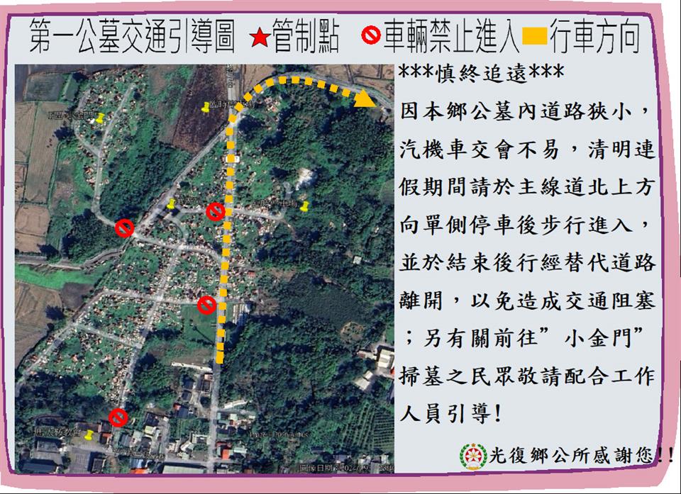 他縣公告 【轉知】公告花蓮縣光復鄉公所第一、第二公墓及第四公墓納骨塔115年清明節連假相關祭祀活動事宜公告 發布日期: 2026/03/24~2026/04/24 | 瀏覽人數: 34人 | 聯絡資訊: 陳文心 04-8972001分機123