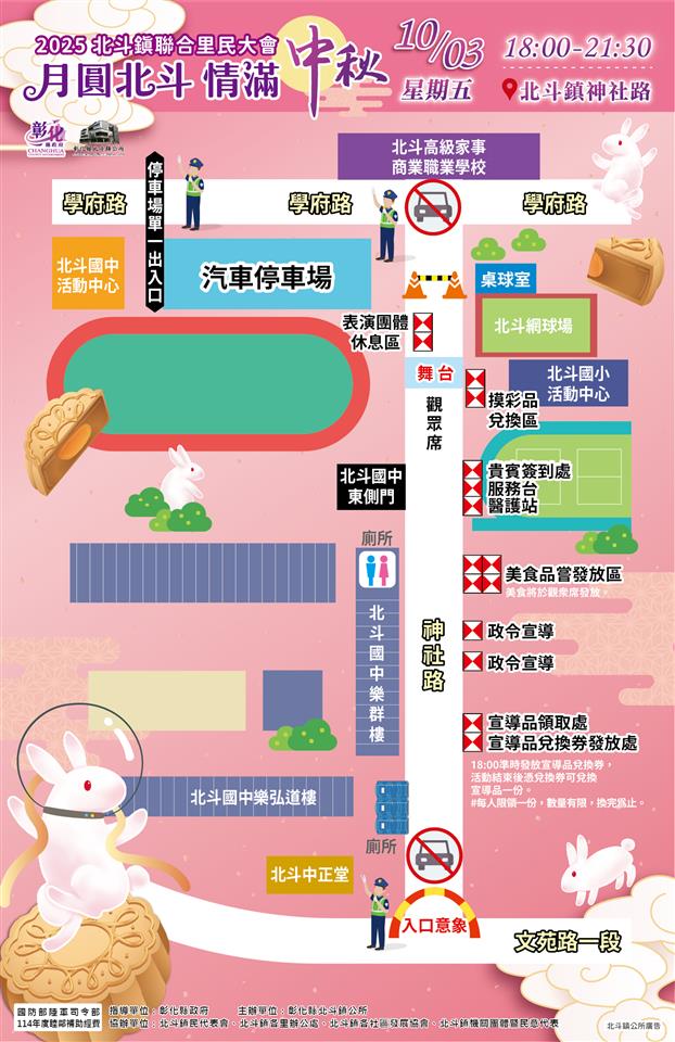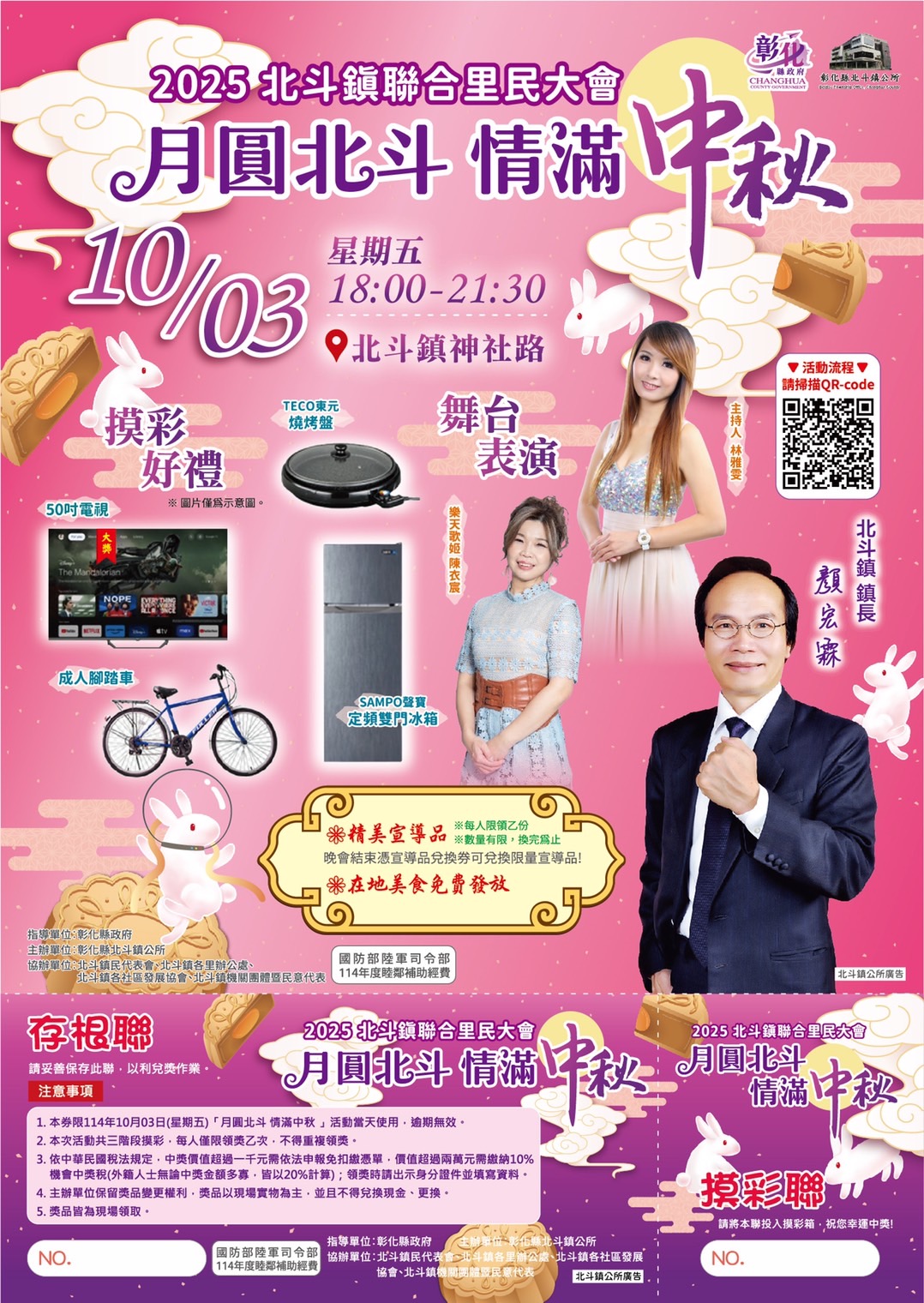 其他資訊 【公告】2025月圓北斗 情滿中秋 中秋節晚會活動🌛 發布日期: 2025/09/23~2025/10/23 | 瀏覽人數: 215人 2025月圓北斗 情滿中秋🌛 中秋節晚會預計於114年10月3日星期五晚上六點在神社路辦理✨ 活動晚會好禮獎不完🎉 邀請大家共襄盛舉一起玩~ ☆相關資訊如圖