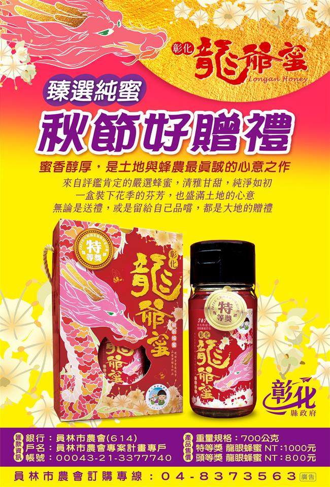 其他資訊 【轉知】彰化縣政府114年度評鑑得獎優質農產品(洋香瓜、紅龍果、津翠番石榴及龍爺蜜訂購資訊 發布日期: 2025/10/01~2025/11/01 | 瀏覽人數: 27人 一、彰化縣114年度優質果品評鑑競賽依據外觀、重量、風味及儀器檢測的糖度等項目進行嚴格品評,參賽果品皆為本縣自行栽植生產並通過農藥檢驗合格,兼具品質及安全。 二、彰化縣114年度『龍爺蜜』國產龍眼蜂蜜品質評鑑競賽,依據無抗生素及農藥殘留者檢測及色澤、香氣、風味嚴謹評選,蜂蜜品質純正有保障,且一桶得獎蜂蜜只能分裝400瓶,數量有限。