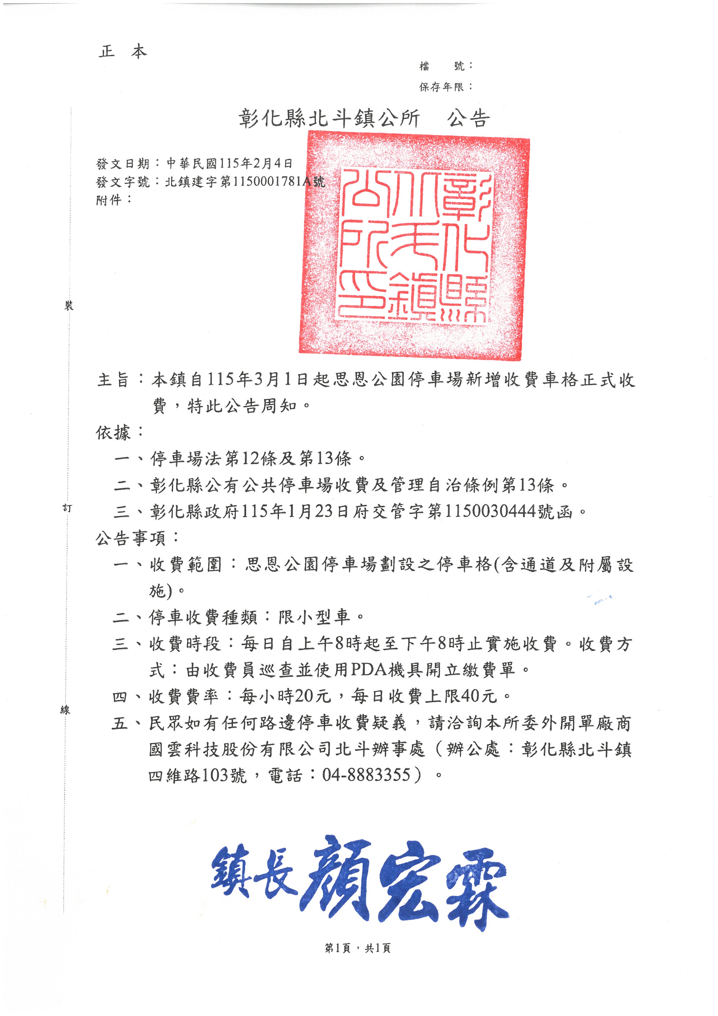 【公告】本鎮自115年3月1日起思恩公園停車場新增收費車格正式收費,特此公告周知