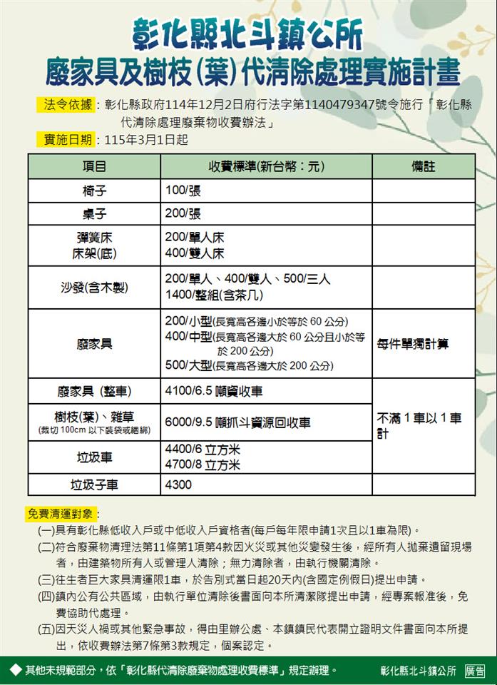 最新公告 【公告】彰化縣北斗鎮公所代清除廢棄家具收費公告 發布日期: 2026/02/10~2036/03/10 | 瀏覽人數: 20人 | 聯絡資訊: 清潔隊 8884166分機380至383 法令依據:彰化縣政府114年12月2日府行法字第1140479347號令施行「彰化縣代清除處理廢棄物收費辦法」。實施日起:115年3月1日起✅ 家具清除費依「品項/尺寸」計價。✅ 大量清運以「車次」收費,未滿一車仍以一車計。✅ 符合低收入戶、災害受災戶、喪家,可檢附證明文件申請免收。❤️貼心提醒: 1️⃣家具清除前,請先聯絡清潔隊確認清運及收費方式。☎️04-8884166分機380至3832️⃣如符合免收資格,請事先準備相關證明文件申請。3️⃣事業廢棄物及裝潢廢棄物依規定不能收運喔!