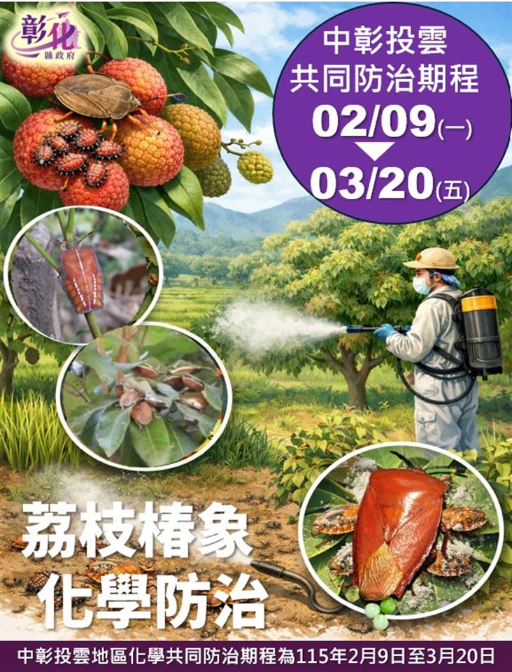 最新公告 【公告】為防範荔枝椿象越冬成蟲爆發,請農友配合『中彰投雲共同防治期程115年2月9日(一)至3月20日(五)』用藥防治,並於開花期前停止施藥,以免誤傷蜂群 發布日期: 2026/02/10~2026/03/31 | 瀏覽人數: 29人