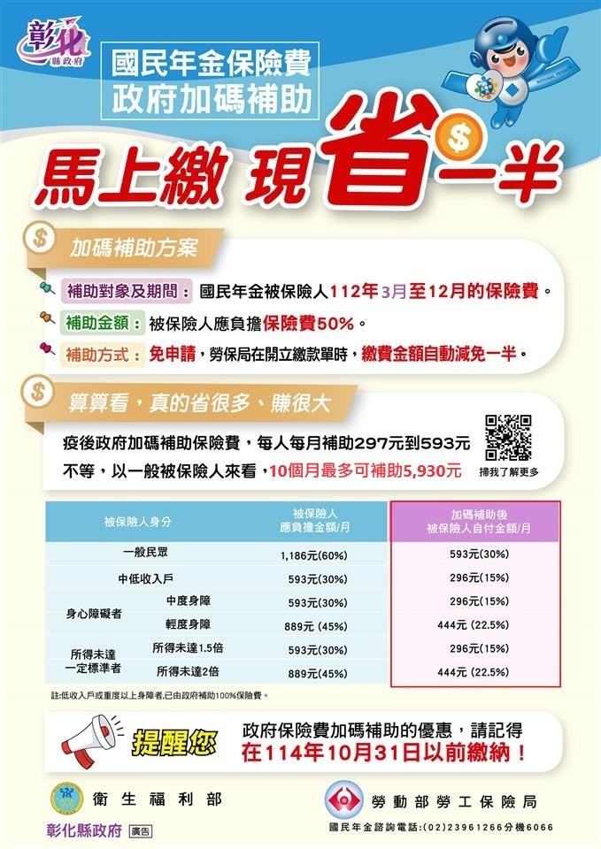 最新公告 <國民年金疫後保費加碼補助方案> 歷史訊息 | 發布日期: 2025/05/10~2025/10/31 | 瀏覽人數: 64人 | 聯絡資訊: 社會課 分機8942980#165 政府加碼補助疫後112年3月至12月國保保險費,提醒上開保險費應在114年10月31日前繳納,才能享有半價優惠!馬上繳,現省一半!彰化縣政府及大城鄉公所關心您!