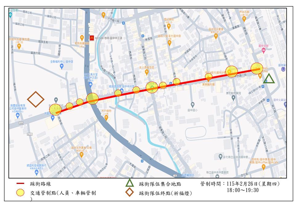 其他資訊 轉知彰化縣田中鎮公所辦理「2026燈高望遠 福佑田中-踩街暨祈福活動」活動週邊道路管制 發布日期: 2026/01/19~2026/02/19 | 瀏覽人數: 14人 | 聯絡資訊: 技士 柳銘輝 04-8761122#273 依據彰化縣田中鎮公所115年1月14日田鎮建字第1150000693號含辦理。