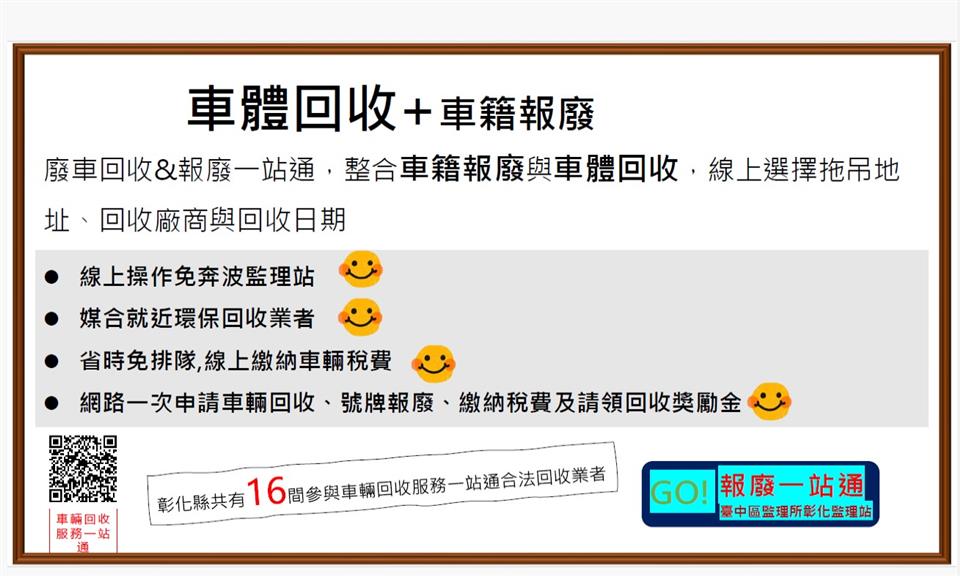 其他資訊 轉知交通部公路局臺中區監理所彰化監理站相關資訊之宣導,詳如說明。 發布日期: 2026/01/21~2026/02/21 | 瀏覽人數: 28人 | 聯絡資訊: 民政課 分機8942980#120 有關車主名下車輛暫時不使用欲辦理繳銷或不堪使用欲辦理報廢登記,民眾可利用【監理服務網】、【車輛回收服務一站通】等線上申辦案。