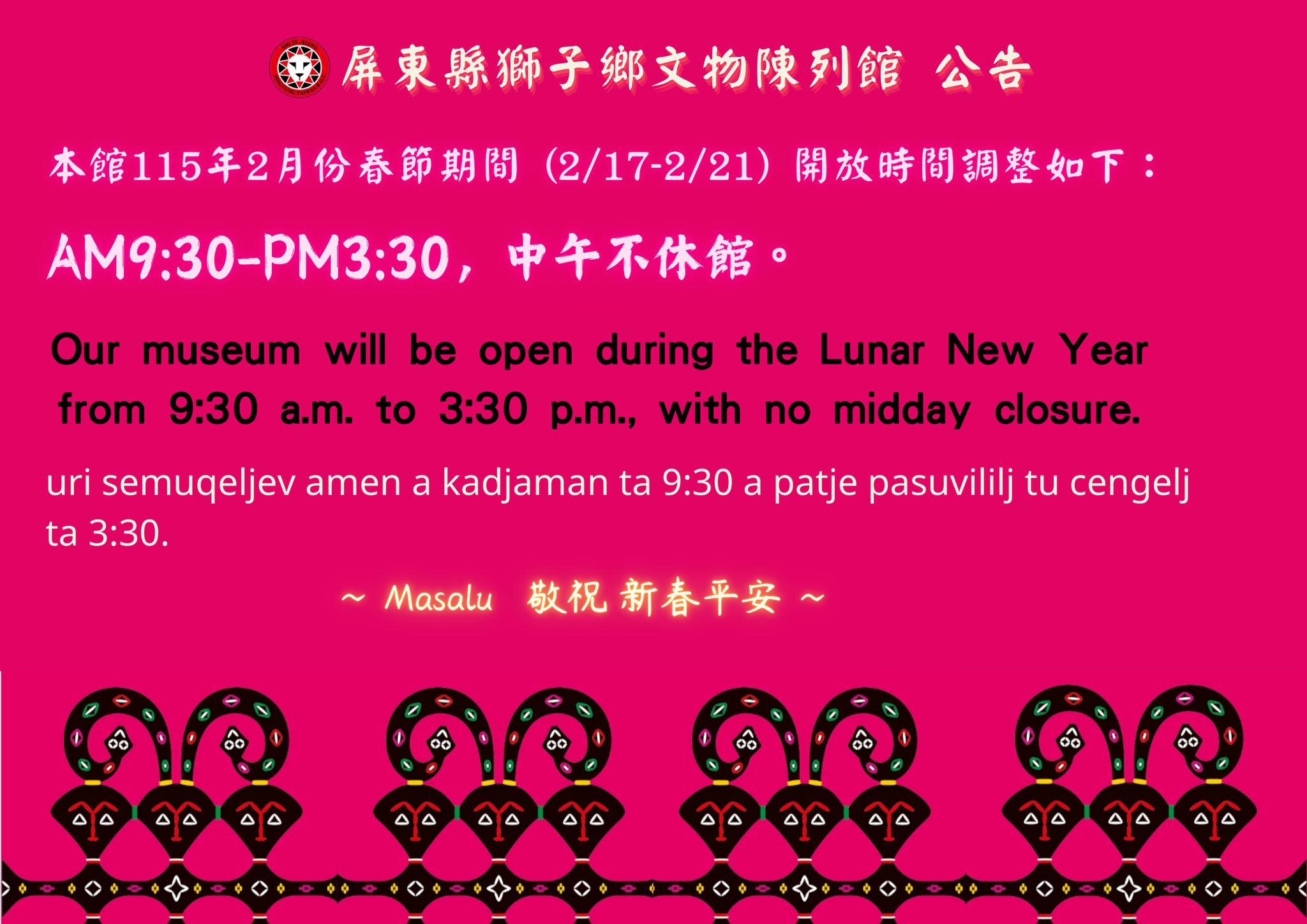 其他資訊 轉知:屏東縣獅子鄉公所辦理「Ki cacepeliw 從海那邊.歡迎回家—瑞典國家世界文化博物館典藏排灣族百年文物重返獅子鄉特展」,春節期間正常開館相關訊息 發布日期: 2026/02/11~2026/03/31 | 瀏覽人數: 17人 | 聯絡資訊: 民政課 分機8942980#111 一、該所刻正辦理「Ki cacepeliw 從海那邊.歡迎回家—瑞典國家世界文化博物館典藏排灣族百年文物重返獅子鄉特展」,係與瑞典國家世界文化博物館及國立臺灣博物館合作,借展 48 件典藏於瑞典國家世界文化博物館之排灣族珍貴文物返臺展示。透過文物返鄉展出,重新連結族群記憶與文化脈絡,深具歷史意義與文化價值,亦為地方文化館推動國際文物交流與文化公共服務之重要成果。 二、旨揭特展展期至115年3月31日止,為使更多民眾於春節連假期間能就近參觀、深入認識原住民族文化內涵,於春節期間(115年2月17日至2月21日,農曆初一至初五)開館,開館時間為每日上午9時30分至下午3時30分,誠摯邀請各界蒞臨參觀,另為提升參觀品質,亦提供團體導覽預約服務,歡迎多加利用。 三、檢附開館公告1份。