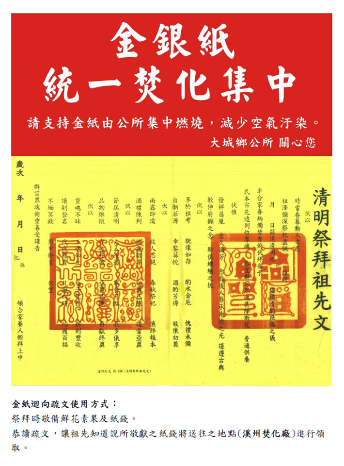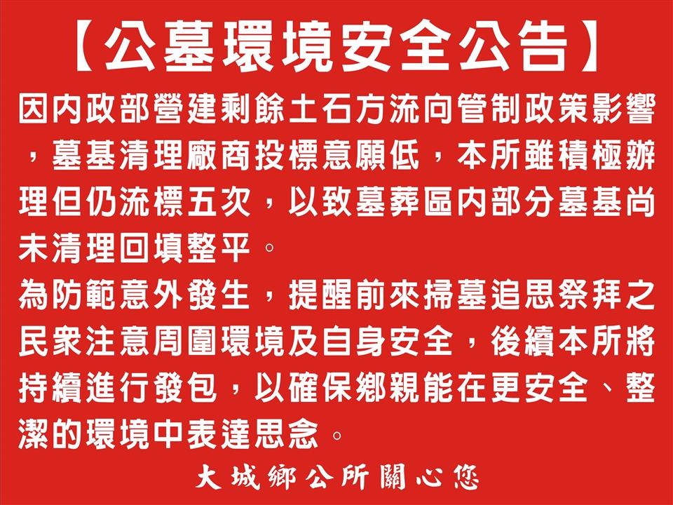 最新公告 大城鄉115年清明節祭祖公告 發布日期: 2026/03/16~2026/04/19 | 瀏覽人數: 93人 | 聯絡資訊: 社會課_許先生 分機8942980#148 本鄉第六示範公墓懷親堂將於115年4月5日(星期日)上午9時舉行清明節超渡法會,敬請隨喜參加。請參拜民眾配合下列事項:1.為分散清明掃墓人潮,本鄉將提早搭設戶外棚架及案桌,鼓勵民眾提早祭祖。 第三示範公墓 : 3月21日至4月19日(三月初三) ; 第六示範公墓 : 3月28日至4月19日(三月初三)2.禁止持香入塔,塔內請合掌祭拜。3.金紙請集中燃燒。4.請停車於停車場,避免交通阻塞。