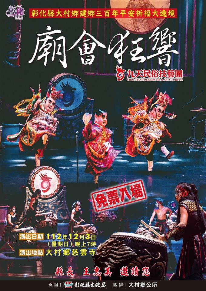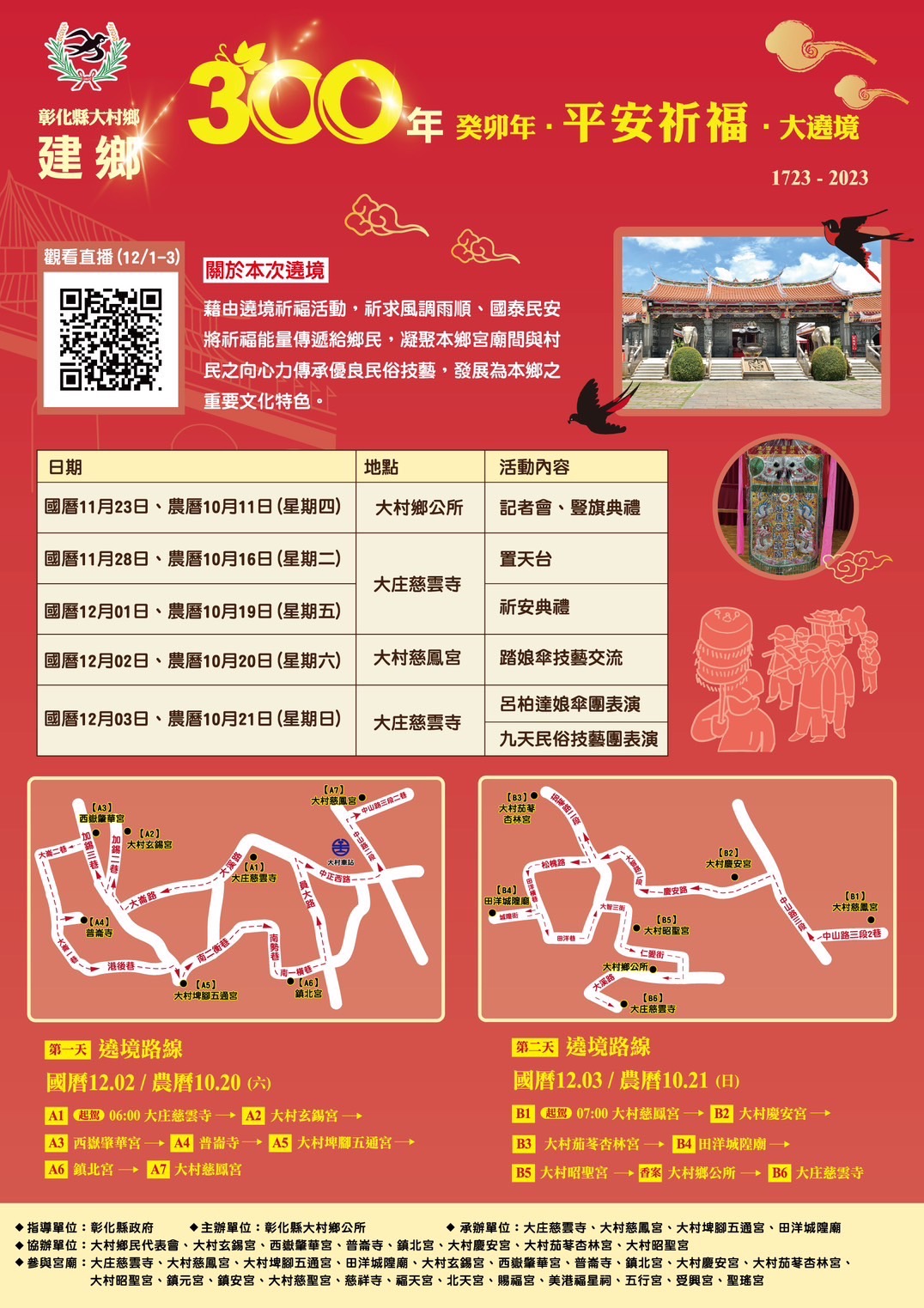 最新公告 ☘️[彰化縣大村鄉建鄉300年遶境活動]☘️ 歷史訊息 | 發布日期: 2023/11/22~2023/12/22 | 瀏覽人數: 80人 | 聯絡資訊: 民政課 04-8520149 [三百年的悸動]#癸卯年 平安祈福🙏藉由神明巡視大村全鄉的「溫庄」,為地方驅除邪煞、退散疫情,更祈求合境平安,全民健康。🙏12/2-12/3一系列的活動大村鄉長賴志銘,邀請鄉親們一起來共襄盛舉,體驗這一場「三百年來的悸動」。