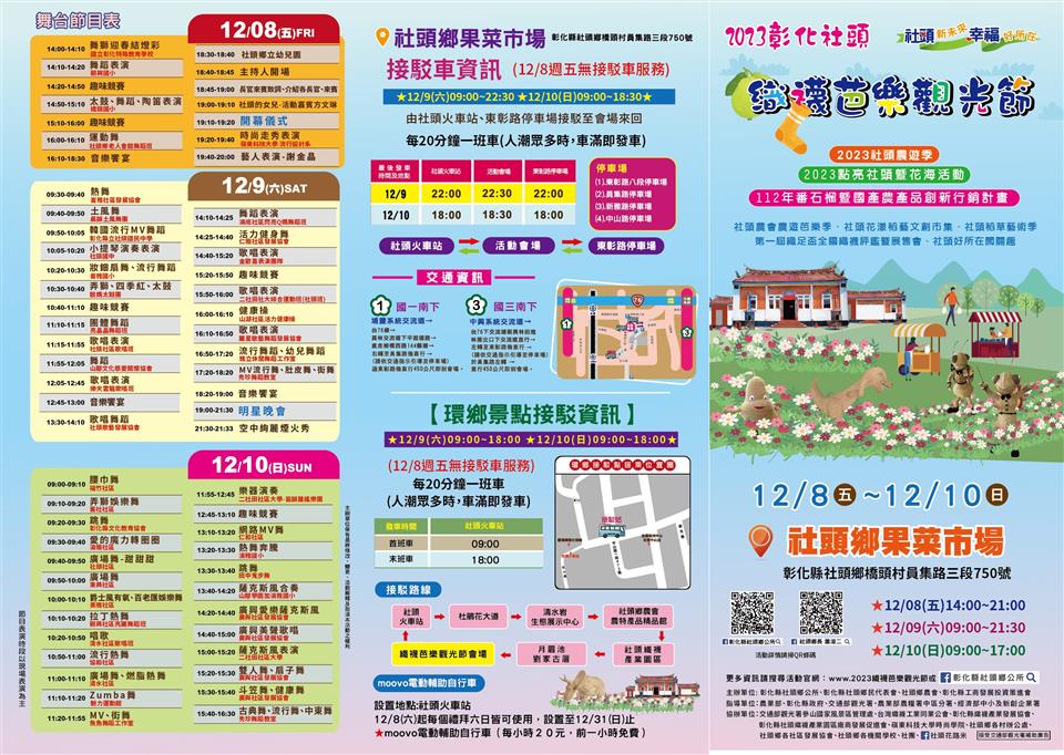 最新公告 2023彰化社頭織襪芭樂觀光節 歷史訊息 | 發布日期: 2023/12/07~2024/01/07 | 瀏覽人數: 37人 | 聯絡資訊: 建設課 04-8520149 「2023彰化社頭織襪芭樂觀光節」將於112年12月8、9、10日舉行歡迎參加。