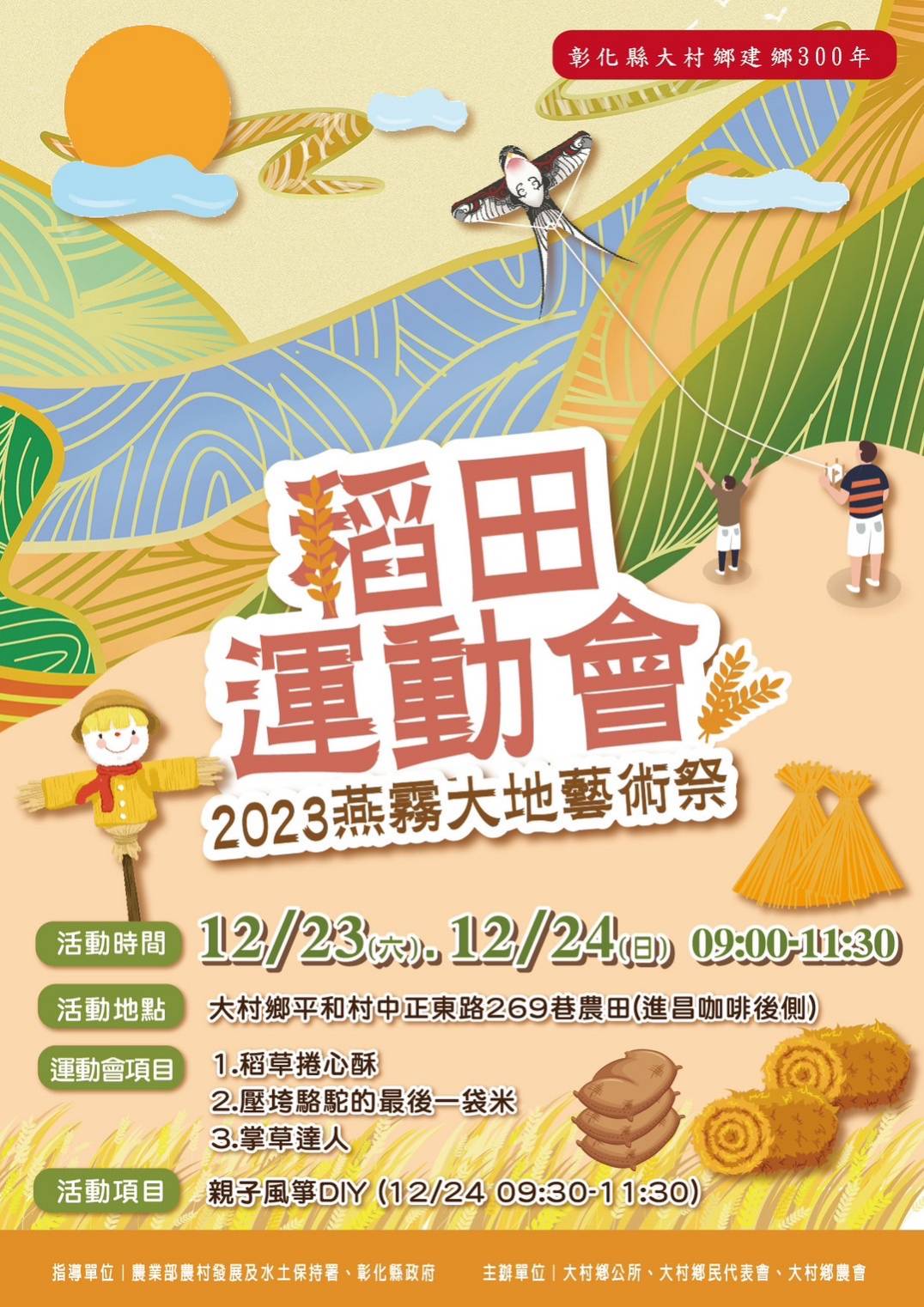 最新公告 2023燕霧大地藝術季『稻田運動會』即將開跑囉🎉🎉 歷史訊息 | 發布日期: 2023/12/15~2024/01/15 | 瀏覽人數: 96人 | 聯絡資訊: 農業課 048520149 活動地點:大村鄉平和村中正東路269巷農田(進昌咖啡後側)活動時間:12/23-12/24一系列活動等鄉親作伙來參加🔝🔝🔝🔝🔝🔝🔝🔝 12/23(六)初賽-稻草運動會比賽項目:📍稻草捲心酥📍壓垮駱駝的最後一袋米📍掌草達人 112年12月24日(日)📍各項運動會競賽決賽📍親子風箏DIY📍花海欣賞✅✅稻草運動會初賽,取計時賽前4名者進入決賽。🥇🥈🥉前3名頒發獎盃1個、獎狀乙紙及禮金,第4名頒發獎狀乙紙及禮品。歡迎👏鄉親一起參加🤗大家可以利用週休,親子一起出動參與各DIY活動,非常適合全家大小參與的戶外活動。