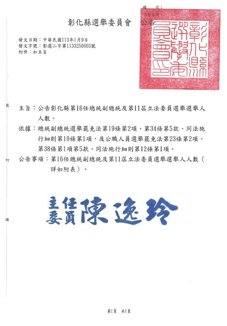 最新公告 第16任總統副總統及第11屆立法委員選舉選舉人人數公告 歷史訊息 | 發布日期: 2024/01/09~2024/02/10 | 瀏覽人數: 51人 | 聯絡資訊: 民政課 04-8520149 依據總統副總統選舉罷免法第19條第2項、第34條第5款、同法施行細則第10條第1項,及公職人員選舉罷免法第23條第2項、第38條第1項第5款、同法施行細則第12條第1項規定辨理。