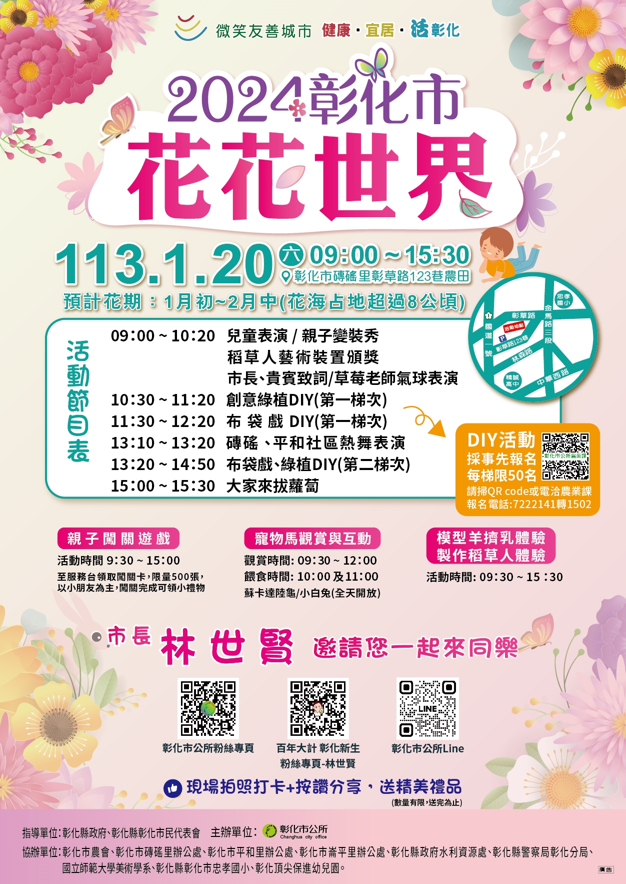最新公告 「2024彰化市 花花世界」花海活動宣傳! 歷史訊息 | 發布日期: 2024/01/15~2024/01/21 | 瀏覽人數: 96人 | 聯絡資訊: 農業課 04-8520149 活動內容有活力舞台秀表演、綠植、環保戲偶DIY、氣球秀、萌寵互動、拔菜頭農事體驗及親子闖關遊樂體驗,還有花田市集、在地農特產品展售等,詳如DM。 活動時間:113年1月20日上午9時至下午3:30時 活動地點:彰化市彰草路123巷入口旁農地(近金馬路3段)