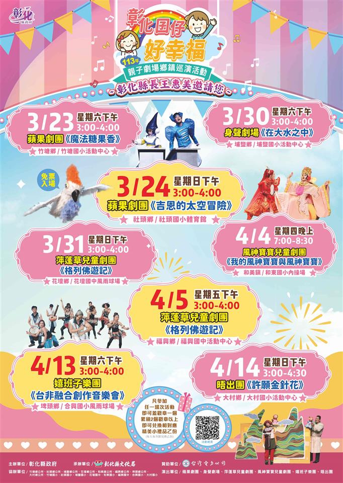 最新公告 彰化囝仔好幸福-113年親子劇場鄉鎮巡演活動即將開跑! 歷史訊息 | 發布日期: 2024/02/16~2024/03/16 | 瀏覽人數: 30人 🔸3/23(六) 下午3:00-4:00 蘋果劇團《魔法糖果香》/竹塘鄉/竹塘國小活動中心 🔸3/24(日) 下午3:00-4:00 蘋果劇團《吉恩的太空冒險》/社頭鄉/社頭國小體育館 🔸3/30(六) 下午3:00-4:00 身聲劇場《在大水之中》/埔鹽鄉/埔鹽國小活動中心 🔸3/31(日) 下午3:00-4:00 萍蓬草兒童劇團《格列佛遊記》/花壇鄉/花壇國中風雨球場 🔸4/4(四) 晚上7:00-8:30 風神寶寶兒童劇團《我的風神寶寶與風神寶寶》/和美鎮/和東國小內操場 🔸4/5(五) 下午3:00-4:00 萍蓬草兒童劇團《格列佛遊記》/福興鄉/福興國中活動中心 🔸4/13(六) 下午3:00-4:00 嬉班子樂團《台非融合創作音樂會》/埤頭鄉/合興國小風雨球場 🔸4/14(日)下午3:00-4:30 晤出團《許願金針花》/大村鄉/大村國小活動中心 📣凡參加任一場次活動,即可蓋戳章一個,累積2個戳章以上,即可兌換相對應精美小禮品乙份(每人每次限兌換乙份)