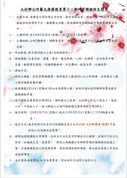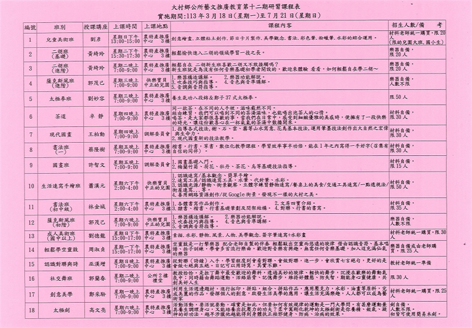 藝文資訊 👏藝文推廣教育第十二期研習課程招生訊息! 歷史訊息 | 發布日期: 2024/02/19~2024/07/21 | 瀏覽人數: 71人 | 聯絡資訊: 行政課 04-8520149 研習課程預定113年3月18日(星期一)至7月21日(星期日)開課,開設美術、國畫🎨、書法✍️、薩克斯風🎷、二胡🪕、太極拳、生活速寫手繪等課程計18班,本期上課地點於鄉公所農特產推廣中心3樓、調解委員會、鄉公所2樓禮堂及快樂寶貝幼兒園,詳如招生簡章及課程表。
