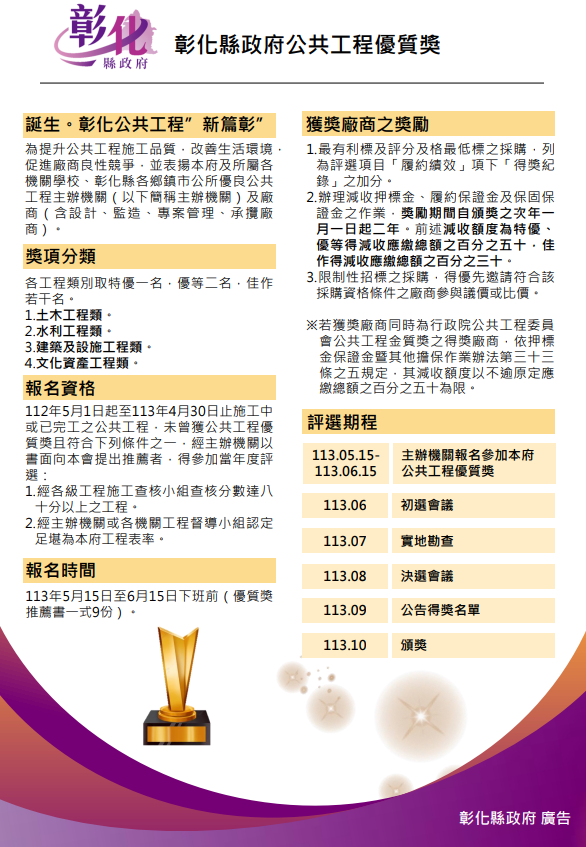 最新公告 彰化縣政府今(113)年辦理首屆公共工程優質獎@ 歷史訊息 | 發布日期: 2024/03/19~2024/04/19 | 瀏覽人數: 50人 | 聯絡資訊: 政風室 04-8520149 一、彰化縣政府為提升公共工程施工品質,改善生活環境,促進廠商良性競爭,並表揚優良公共工程主辦機關、廠商,將於今(113)年辦理首屆公共工程優質獎評選及獎勵作業,相關評選及獎勵作業規定如附件。 二、參獎資格為112年5月1日起至113年4月30日止施工中或已完工之公共工程,未曾獲公共工程優質獎且符合下列條件之一,經主辦機關以書面向本會(公共工程優質獎評選委員會)提出推薦者,得參加當年度評選:1. 經各級工程施工查核小組查核分數達八十分以上之工程。2. 經主辦機關或各機關工程督導小組認定足堪為本縣工程表率。 三、各機關如有符合參獎資格之工程,請參照「彰化縣政府公共工程優質獎評選及獎勵作業要點」之規定,於113年5月15日至6月15日前報名參加。