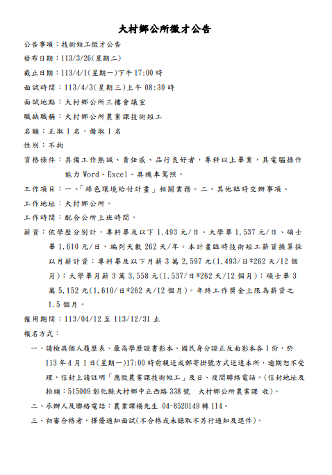 徵才資訊 大村鄉公所徵才公告-技術短工 歷史訊息 | 發布日期: 2024/03/26~2024/04/01 | 瀏覽人數: 55人 | 聯絡資訊: 農業課 04-8520149 公告事項:技術短工徵才公告發布日期:113/3/26(星期二)截止日期:113/4/1(星期一)下午17:00時面試時間:113/4/3(星期三)上午08:30時面試地點:大村鄉公所三樓會議室職缺職稱:大村鄉公所農業課技術短工 名額:正取1名,備取1名