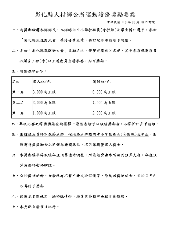 最新公告 公告「彰化縣大村鄉公所運動績優獎勵要點」~ 歷史訊息 | 發布日期: 2024/03/27~2024/04/27 | 瀏覽人數: 46人 | 聯絡資訊: 社政課 04-8520149 為獎勵設籍本鄉鄉民、本鄉轄內中小學教職員(含教練)及學生擔任選手,參加「彰化縣民運動大會」榮獲優秀成績,特訂定本要點。