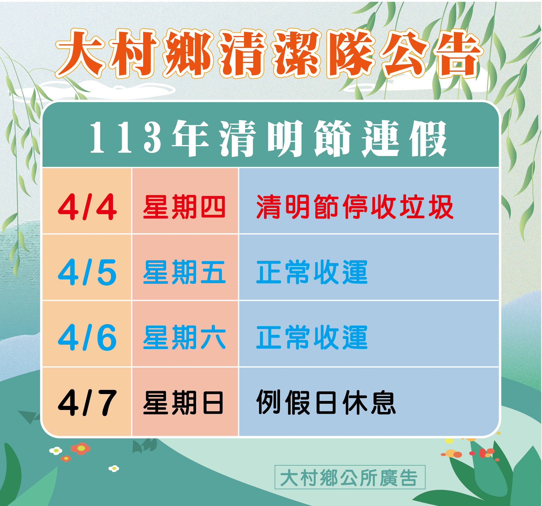 最新公告 👉清明節連假垃圾收運通知👈 歷史訊息 | 發布日期: 2024/04/01~2024/05/01 | 瀏覽人數: 49人 | 聯絡資訊: 清潔隊 04-8520149 👉清明節連假垃圾收運通知👈⏰4/4(四)停收垃圾⏰4/5(五)正常收運垃圾、定點收運垃圾暫停🚍⏰4/6(六)正常收運垃圾🙏請鄉親留意並確實做好垃圾及回收分類與生熟廚餘分類🙏